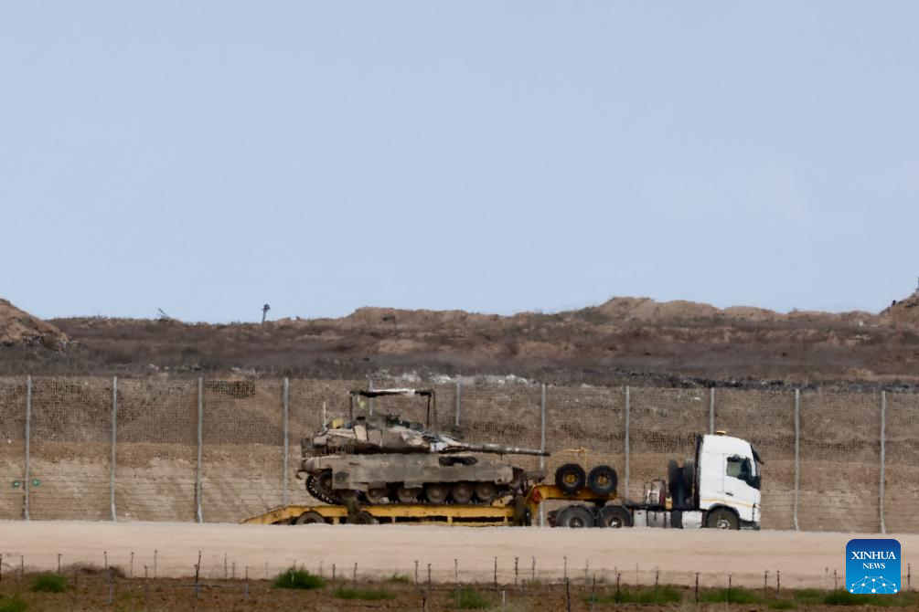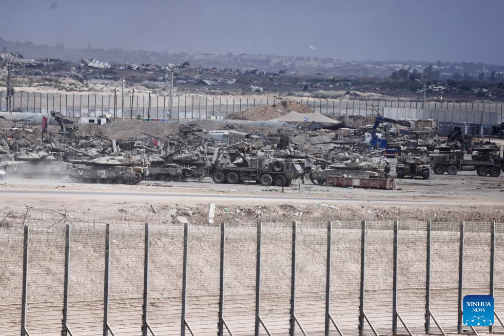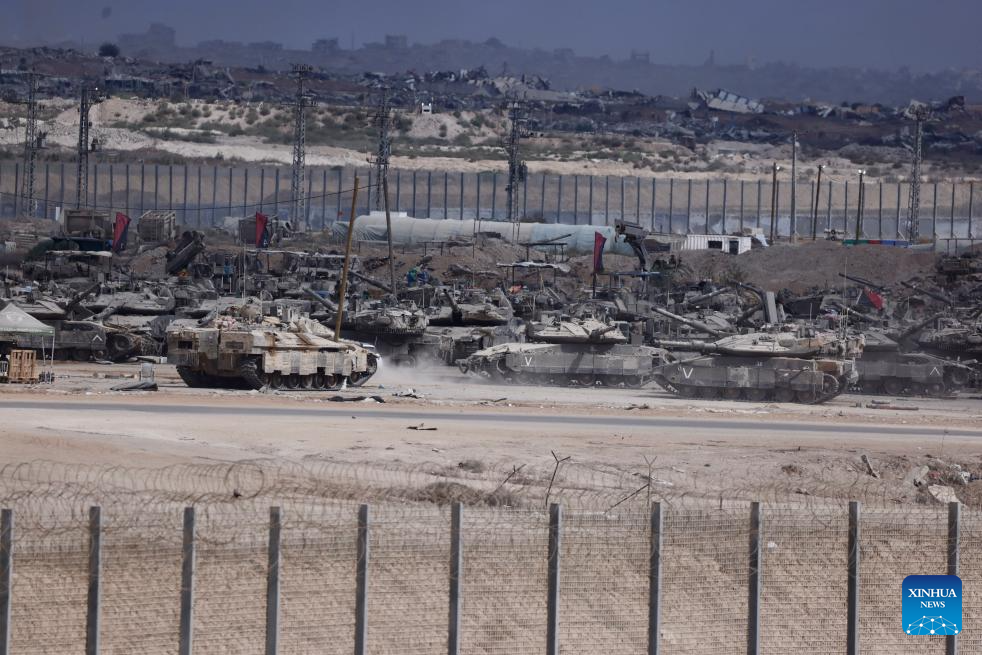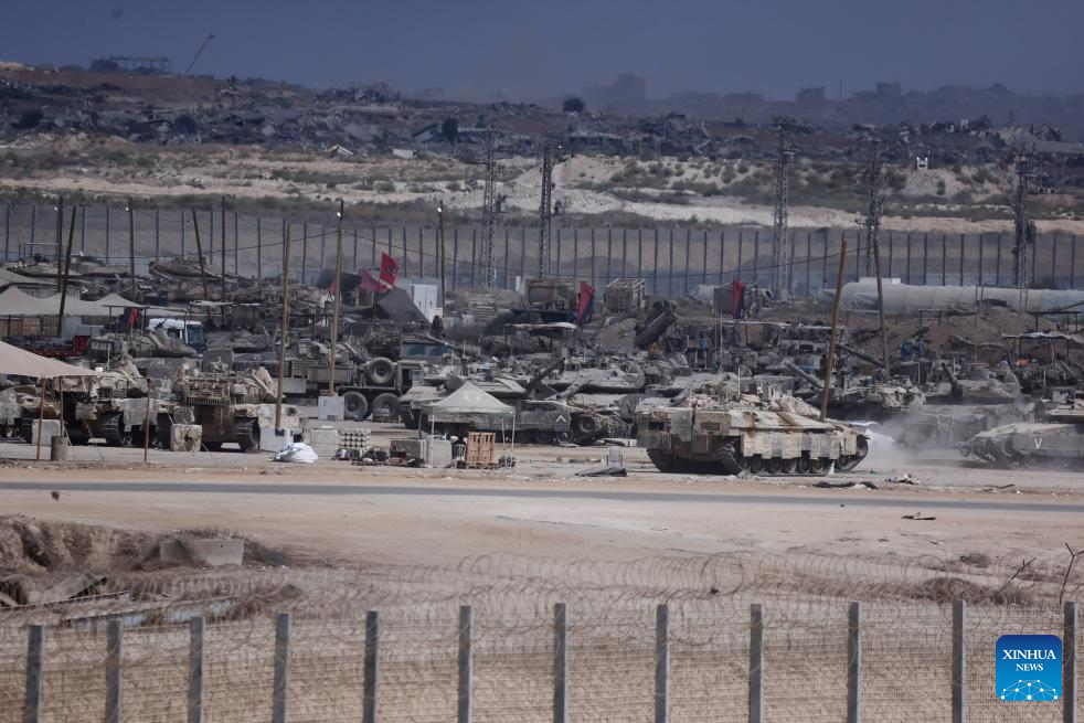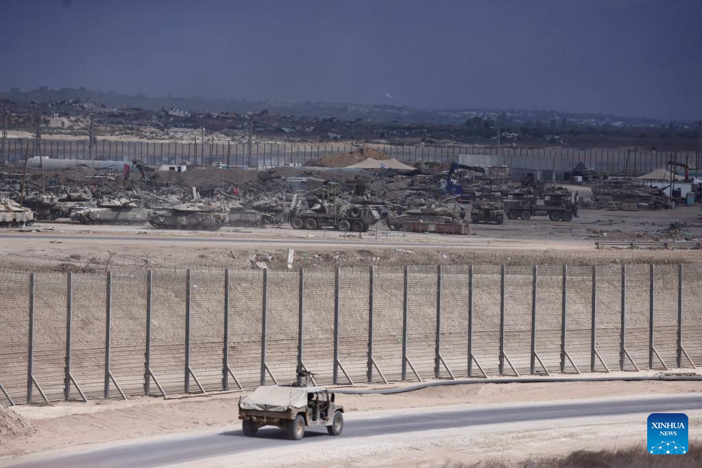 Israeli military vehicles are seen on the Israeli border with Gaza on Oct. 9, 2025. Israel and Hamas are preparing to implement a Gaza ceasefire agreement, with an official signing ceremony expected later Thursday in Egypt's Sharm el-Sheikh following three days of intensive negotiations mediated by Egypt, Qatar, Türkiye and the United States, according to Palestinian and Israeli sources. (Photo by Jamal Awad/Xinhua)