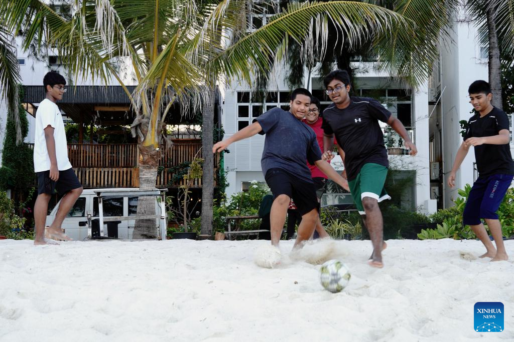 People have fun on the seashore in Hulhumale, Maldives, Oct. 3, 2025. (Xinhua/Wu Yue)