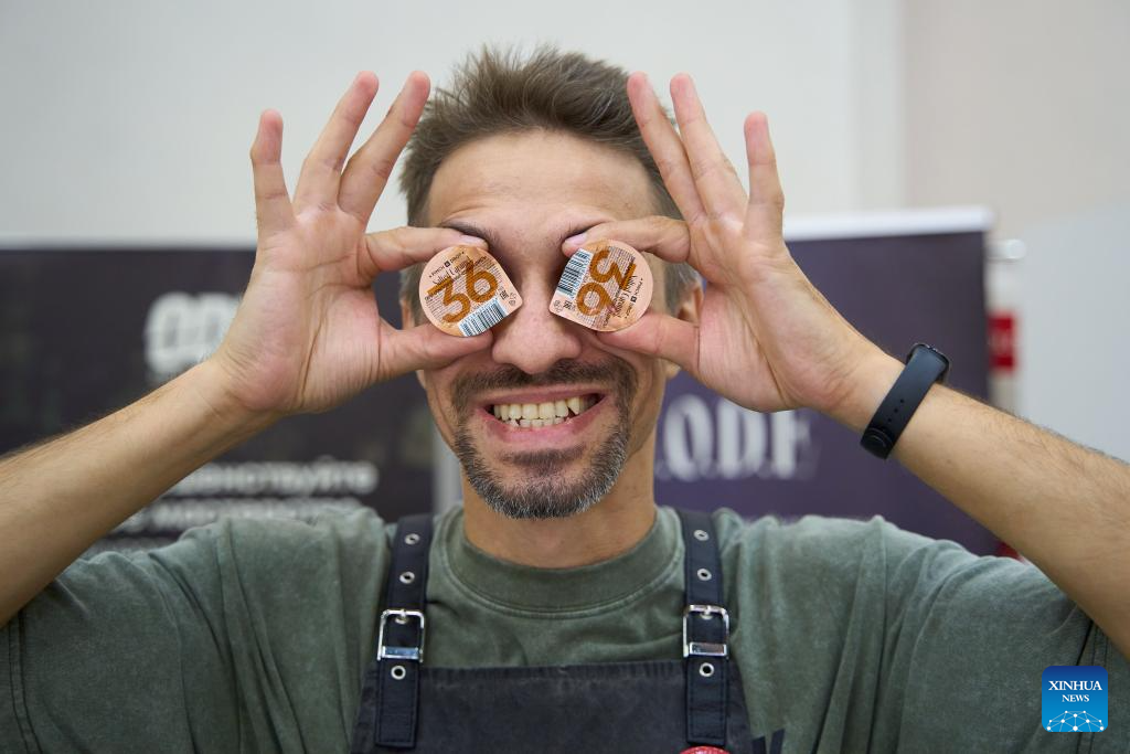 A staff member shows coffee syrup during the Far Eastern Tea and Coffee Championship in Vladivostok, Russia, Oct. 9, 2025. The event was held here on Thursday, drawing 12 baristas to compete by showcasing their skills in making espresso and latte drinks. (Photo by Guo Feizhou/Xinhua)