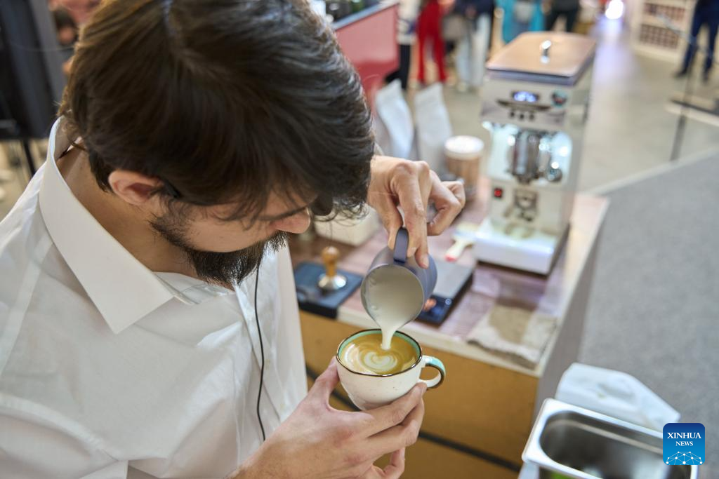 A barista makes coffee for a visitor during the Far Eastern Tea and Coffee Championship in Vladivostok, Russia, Oct. 9, 2025. The event was held here on Thursday, drawing 12 baristas to compete by showcasing their skills in making espresso and latte drinks. (Photo by Guo Feizhou/Xinhua)