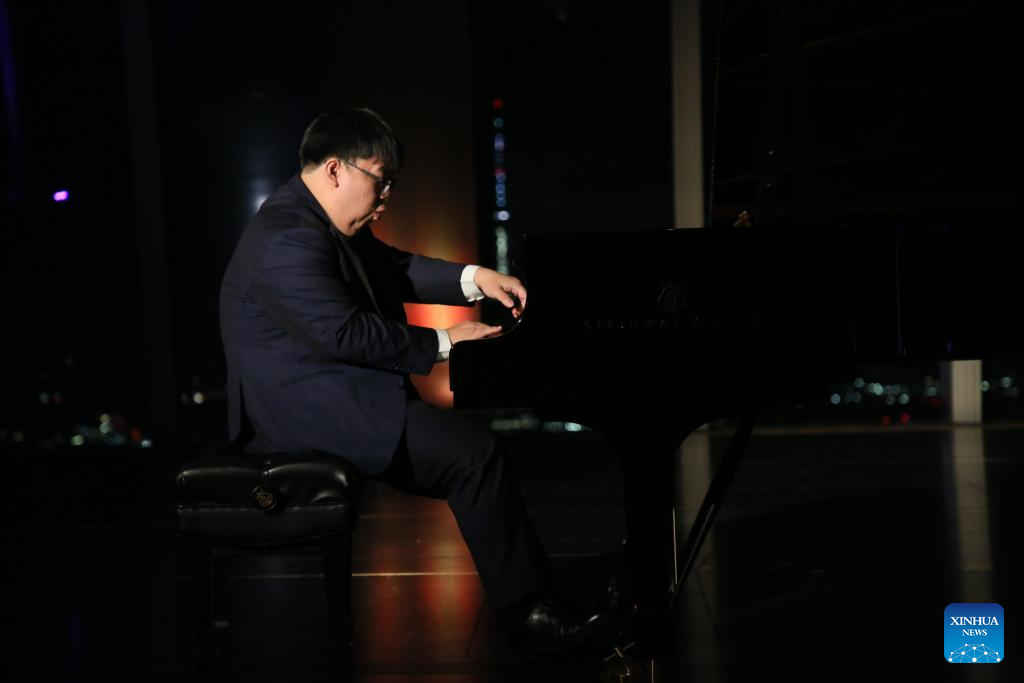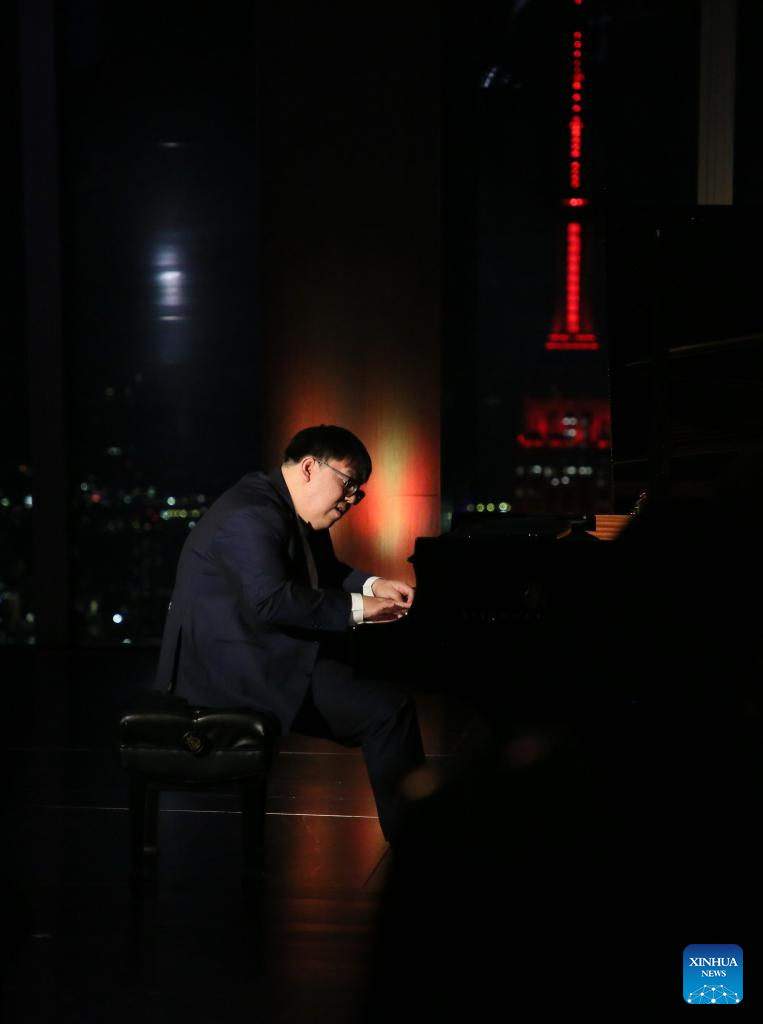 Pianist Wei Zijian performs during a concert named Moonlit Melodies to celebrate the Mid-Autumn Festival at the Peak Event Space of the Edge in New York city, the United States, on Oct. 6, 2025. The Mid-Autumn Festival in China, which is celebrated annually on the 15th day of the eighth month in the Chinese lunar calendar, falls on Oct. 6 this year. (Xinhua/Zhang Fengguo)