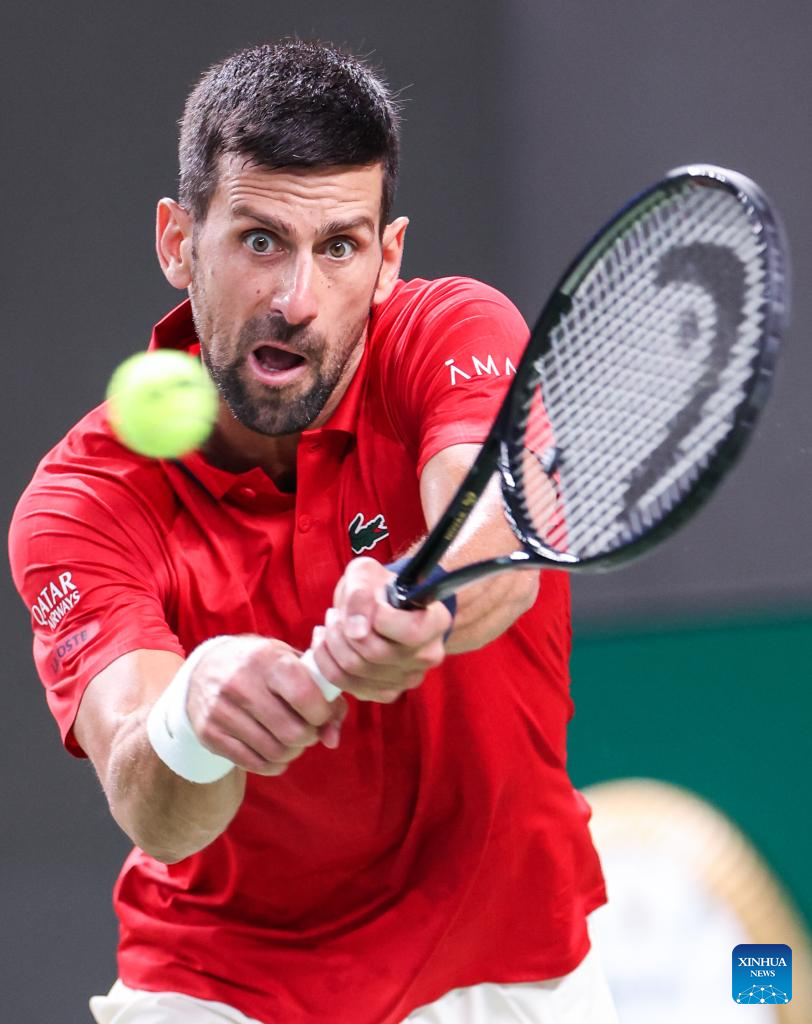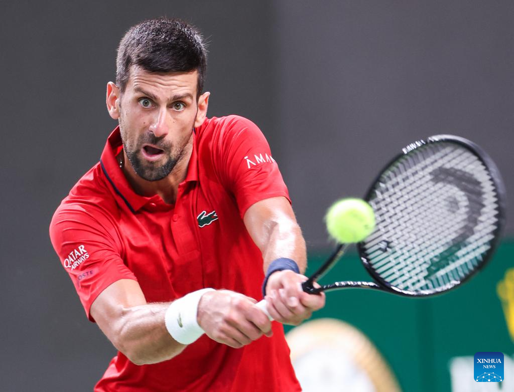 Novak Djokovic hits a return during the men's singles quarterfinal between Novak Djokovic of Serbia and Zizou Bergs of Belgium at the ATP World Tour Shanghai Masters tennis tournament in Shanghai, east China, Oct. 9, 2025. (Xinhua/Ding Ting)