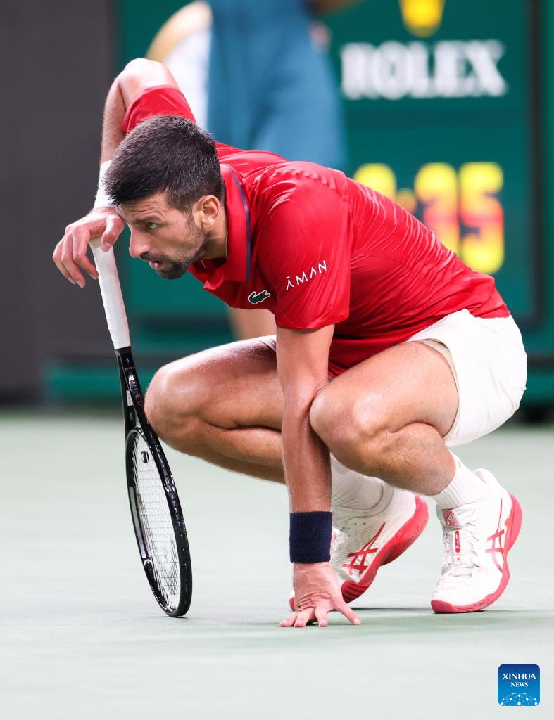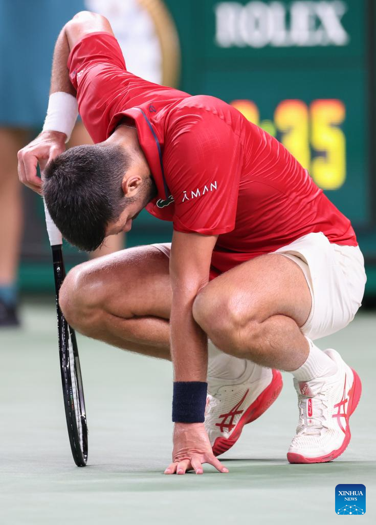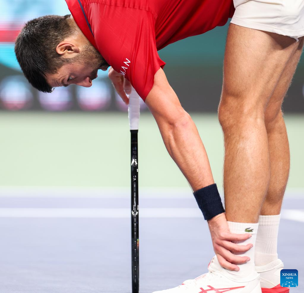 Novak Djokovic holds his ankle during the men's singles quarterfinal between Novak Djokovic of Serbia and Zizou Bergs of Belgium at the ATP World Tour Shanghai Masters tennis tournament in Shanghai, east China, Oct. 9, 2025. (Xinhua/Ding Ting)