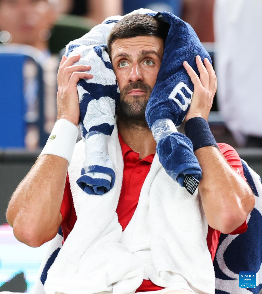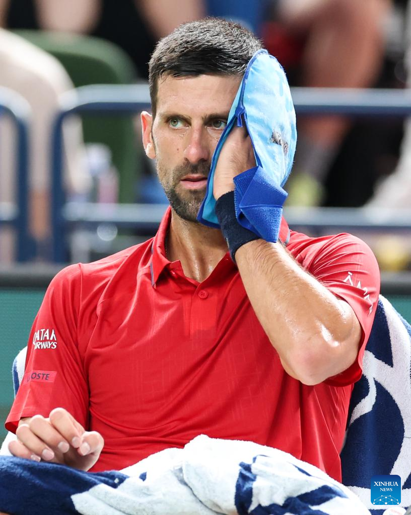 Novak Djokovic wipes his face during the men's singles quarterfinal between Novak Djokovic of Serbia and Zizou Bergs of Belgium at the ATP World Tour Shanghai Masters tennis tournament in Shanghai, east China, Oct. 9, 2025. (Xinhua/Ding Ting)