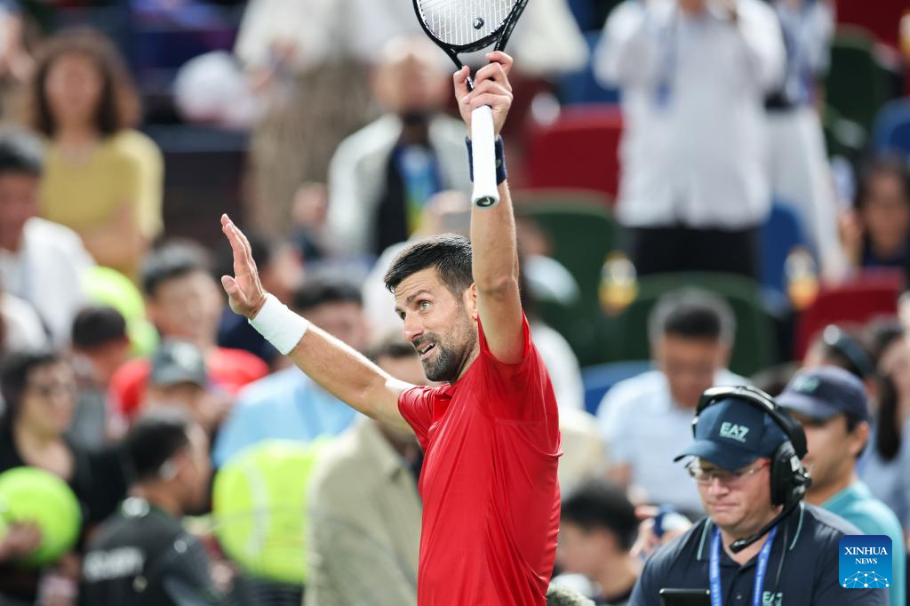 Novak Djokovic waves to spectators after the men's singles quarterfinal between Novak Djokovic of Serbia and Zizou Bergs of Belgium at the ATP World Tour Shanghai Masters tennis tournament in Shanghai, east China, Oct. 9, 2025. (Xinhua/Ding Ting)