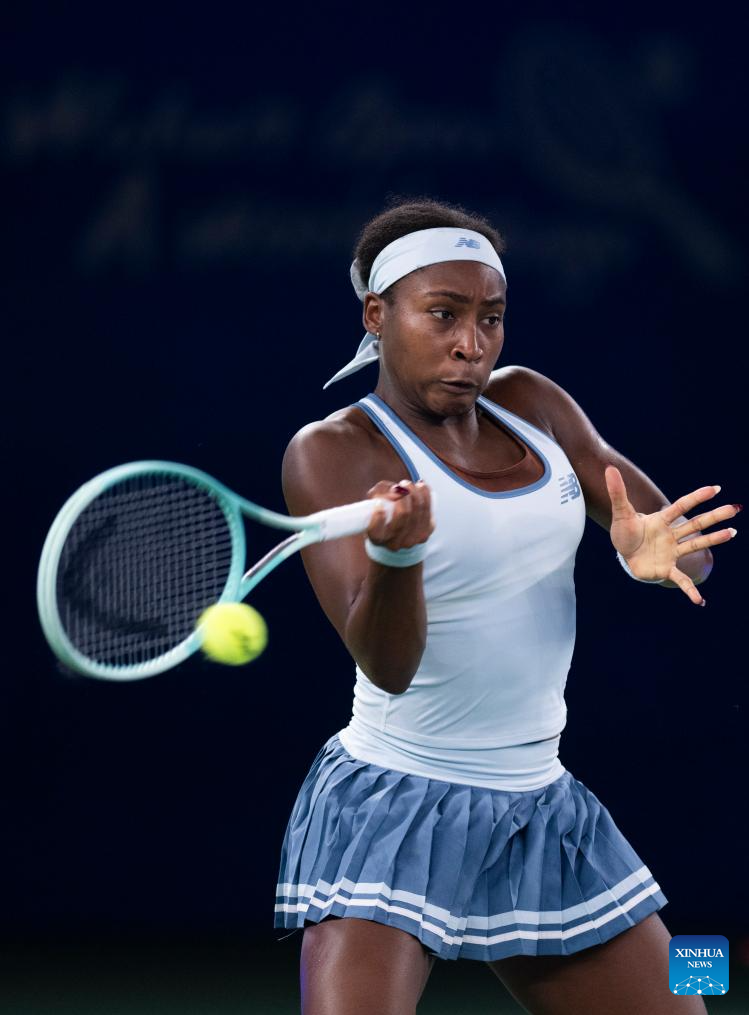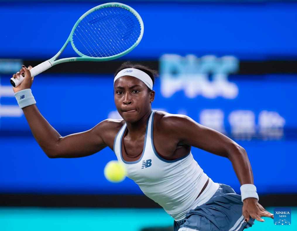 Coco Gauff of the United States hits a return during the women's singles round of 16 match against Zhang Shuai of China at the 2025 Wuhan Open tennis tournament in Wuhan, central China's Hubei Province, Oct. 9, 2025. (Xinhua/Wu Zhizun)