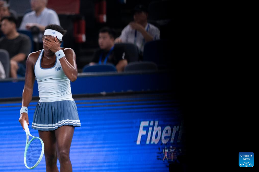 Coco Gauff of the United States reacts during the women's singles round of 16 match against Zhang Shuai of China at the 2025 Wuhan Open tennis tournament in Wuhan, central China's Hubei Province, Oct. 9, 2025. (Xinhua/Wu Zhizun)