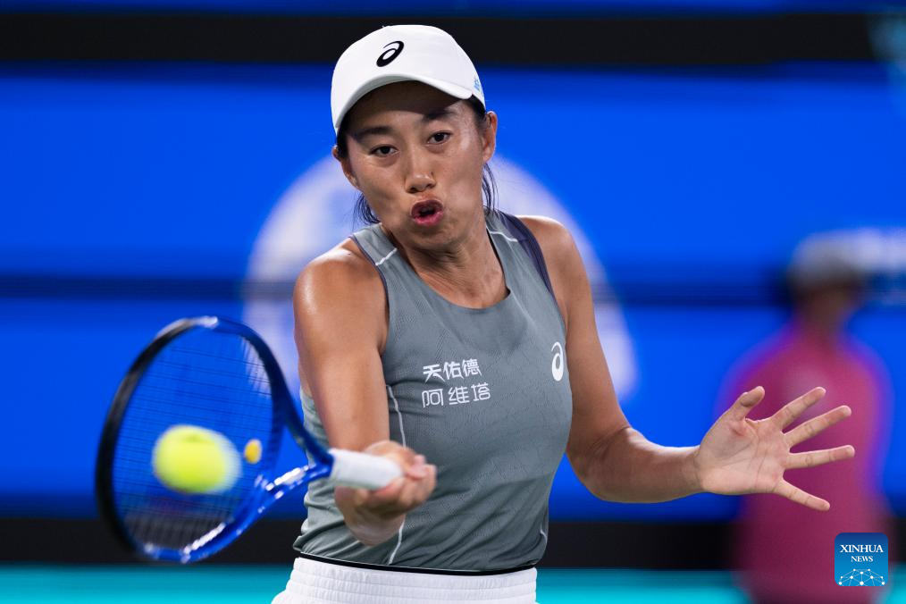 Zhang Shuai of China hits a return during the women's singles round of 16 match against Coco Gauff of the United States at the 2025 Wuhan Open tennis tournament in Wuhan, central China's Hubei Province, Oct. 9, 2025. (Xinhua/Wu Zhizun)
