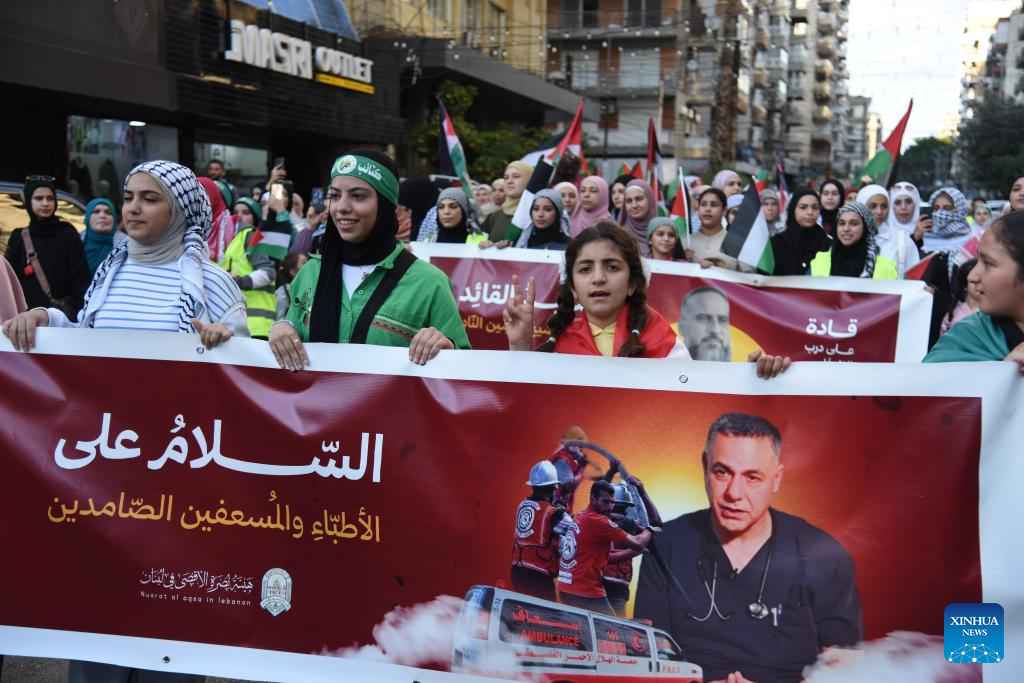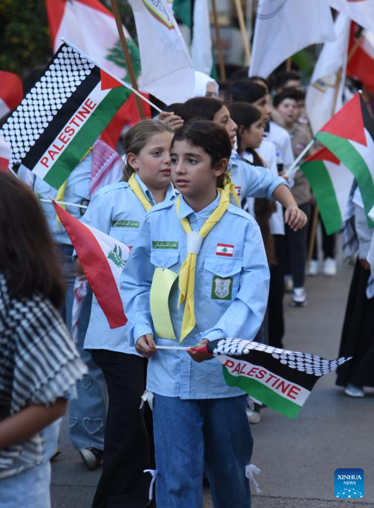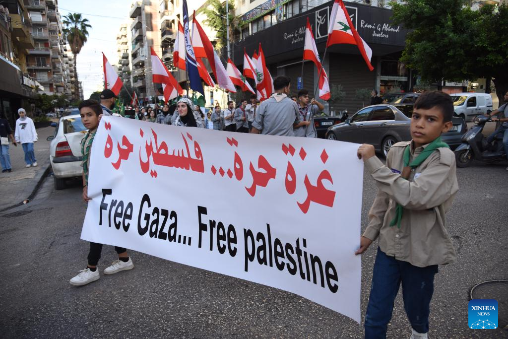 Photo taken on Oct. 10, 2025, shows a march held in solidarity with Gaza and to celebrate the ceasefire agreement in Gaza, in Tripoli, the largest city in northern Lebanon. A ceasefire agreement between Israel and Hamas came into effect in the Gaza Strip at 12:00 noon local time (0900 GMT) on Friday, according to sources. (Photo by Khaled Habashiti/Xinhua)