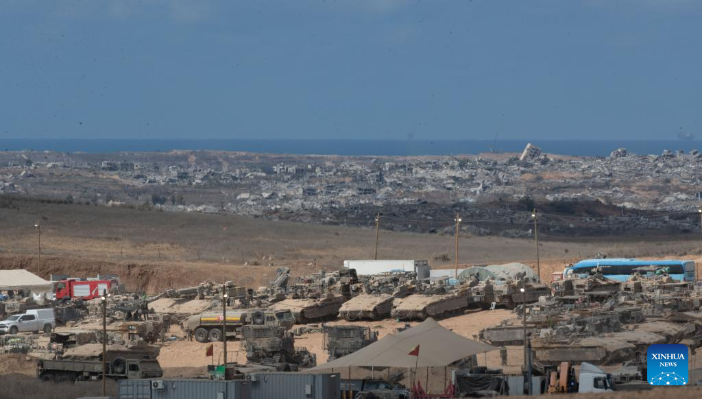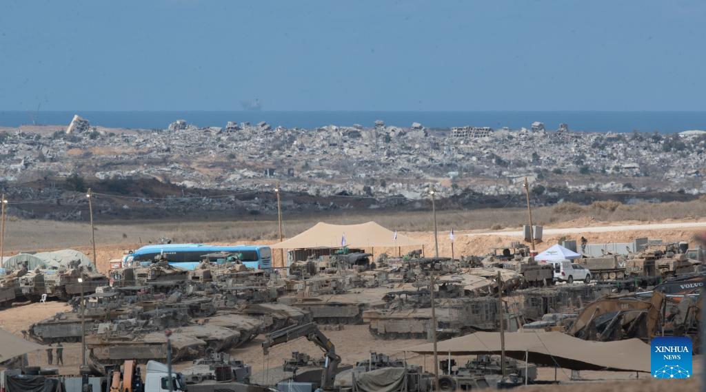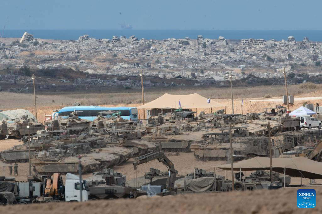 Israeli military vehicles are seen on the Israeli border with Gaza on Oct. 10, 2025. A ceasefire agreement between Israel and Hamas came into effect in the Gaza Strip at 12:00 noon local time (0900 GMT) on Friday, according to sources. (Xinhua/Chen Junqing)