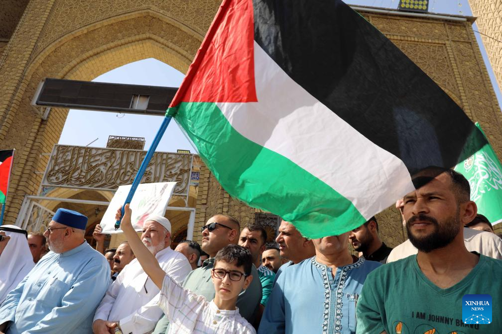 Iraqis attend a rally to celebrate the ceasefire agreement in Gaza, in Baghdad, Iraq, Oct. 10, 2025. A ceasefire agreement between Israel and Hamas came into effect in the Gaza Strip at 12:00 noon local time (0900 GMT) on Friday, according to sources. (Xinhua/Khalil Dawood)