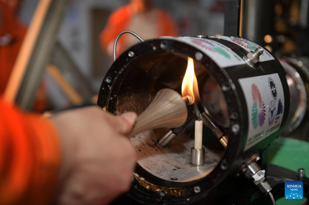 A staff member takes the "source flame" extracted and ignited from combustible ice lying over 1,500 meters beneath the surface of the South China Sea, on Sept. 18, 2025. The "source flame" is taken for the upcoming China's 15th National Games, 12th National Games for Persons with Disabilities and 9th National Special Olympic Games. (Xinhua/Lu Hanxin)