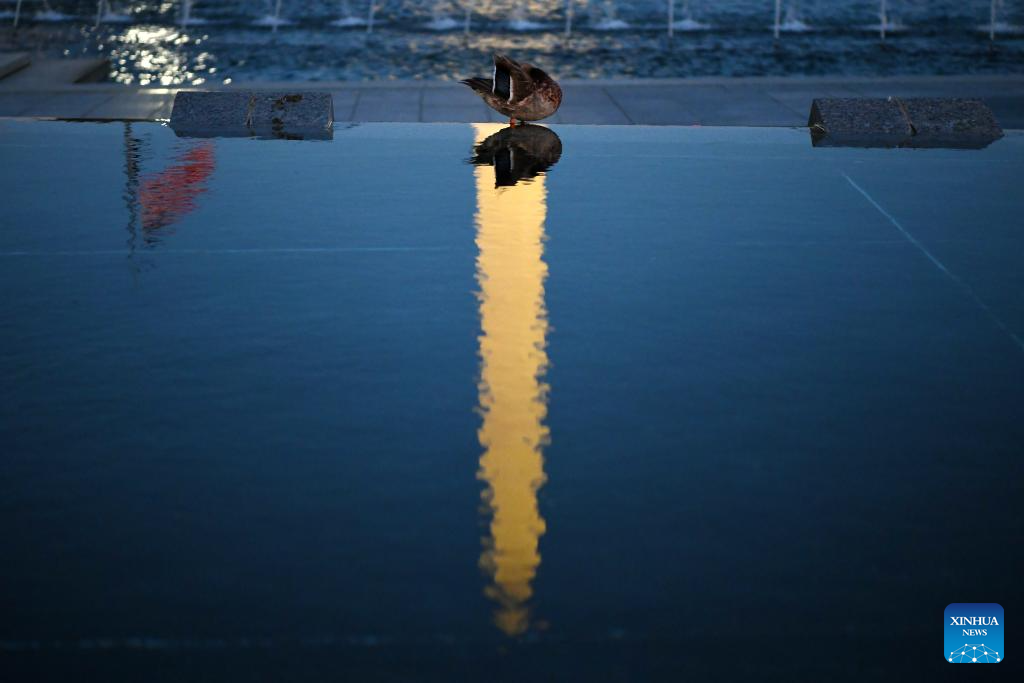 A duck preens its feathers on the reflection of the Washington Monument in Washington, D.C., the United States, Oct. 8, 2025.