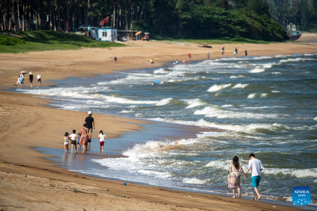 Tourists have fun along the beach in Boao, Qionghai City of south China's Hainan Province, Oct. 8, 2025. China recorded 888 million domestic tourist trips during the eight-day National Day and Mid-Autumn Festival holiday, up 123 million from the seven-day National Day holiday in 2024, the Ministry of Culture and Tourism said Thursday.