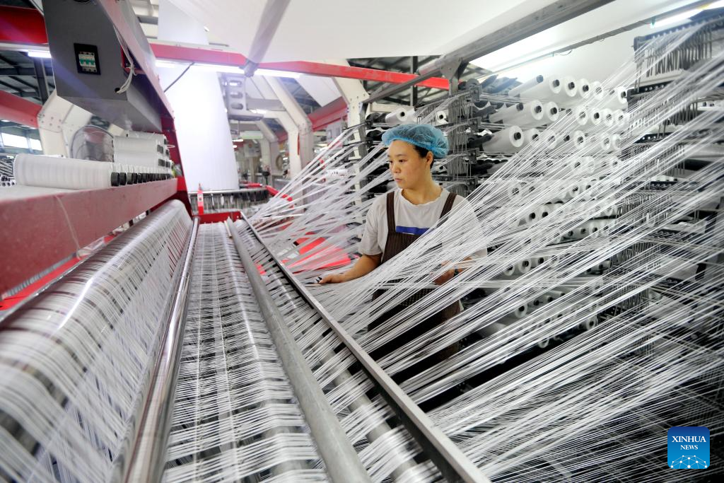 A worker works on a production line of a woven bag manufacturing enterprise in Lianyungang City, Jiangsu Province, Oct. 9, 2025. (Photo by Wang Chun/Xinhua)