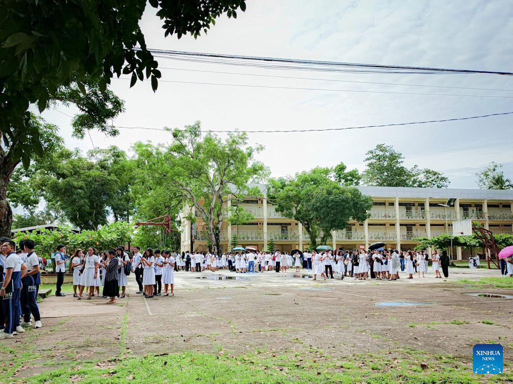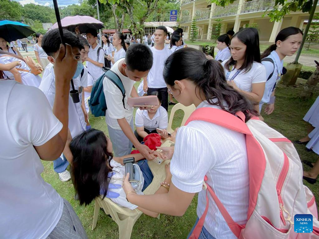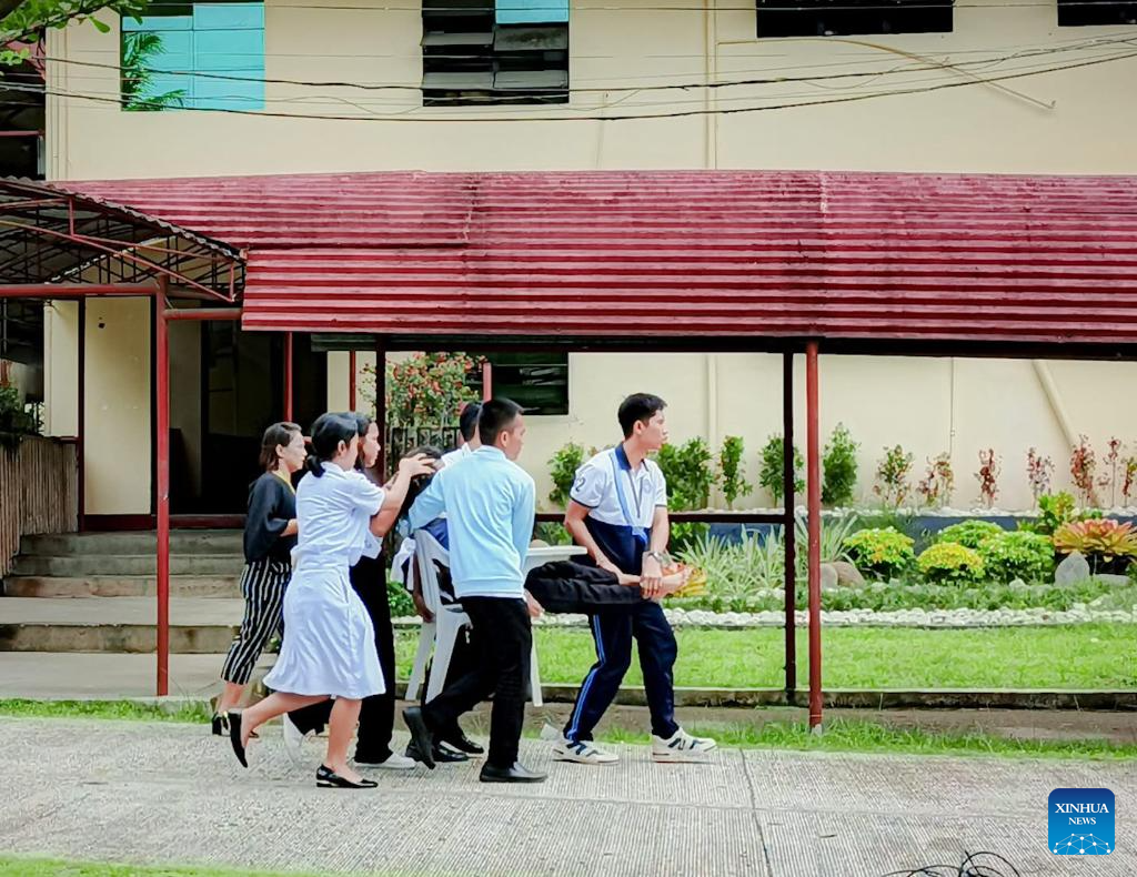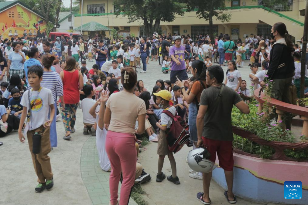 People gather outside school buildings after a 7.5-magnitude earthquake in Davao Del Sur Province, the Philippines, Oct. 10, 2025. An offshore earthquake with a magnitude of 7.5 struck Davao Oriental province in the southern Philippines on Friday morning, prompting the Philippine Institute of Volcanology and Seismology to issue a tsunami warning for coastal areas in Mindanao. In a report, the institute said that the quake, which occurred at 9:43 a.m. local time (0143 GMT), struck at a depth of 20 kilometers, approximately 44 kilometers northeast of the municipality of Manay. (Str/Xinhua)