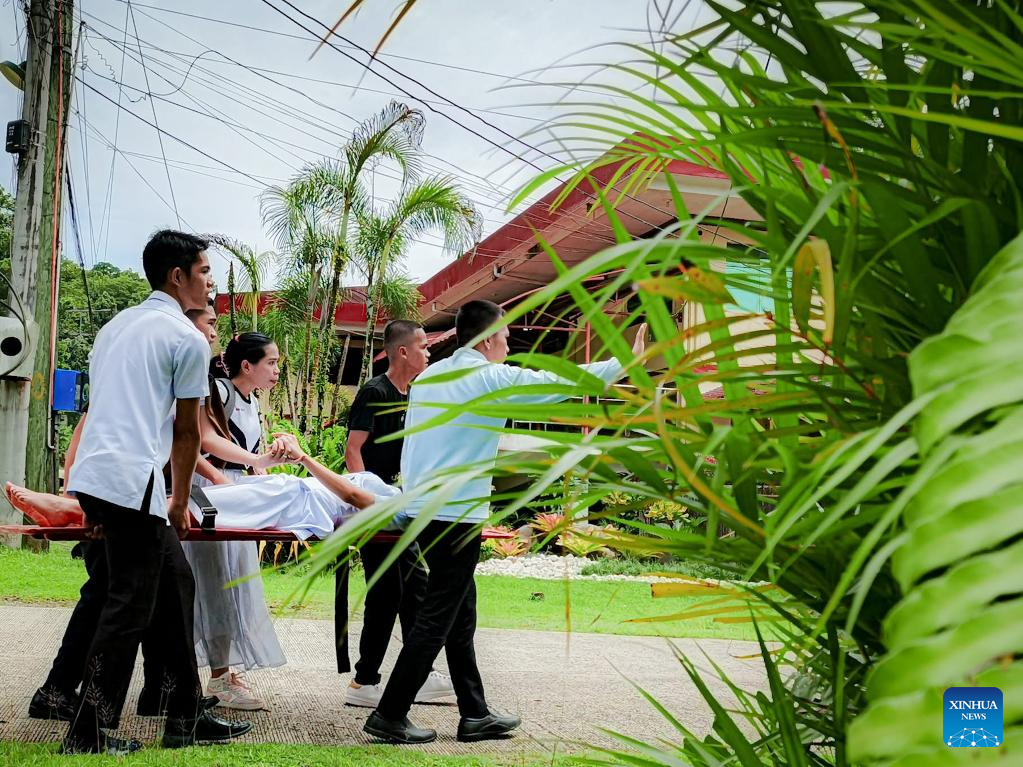 Students transfer a person needing medical attention after a 7.5-magnitude earthquake in Agusan Del Sur Province, the Philippines, Oct. 10, 2025.