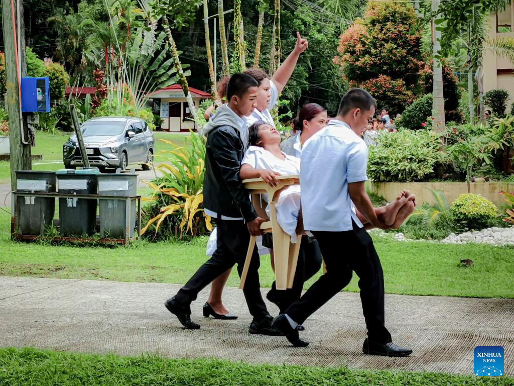 Students tend to a person needing medical attention after a 7.5-magnitude earthquake in Agusan Del Sur Province, the Philippines, Oct. 10, 2025.