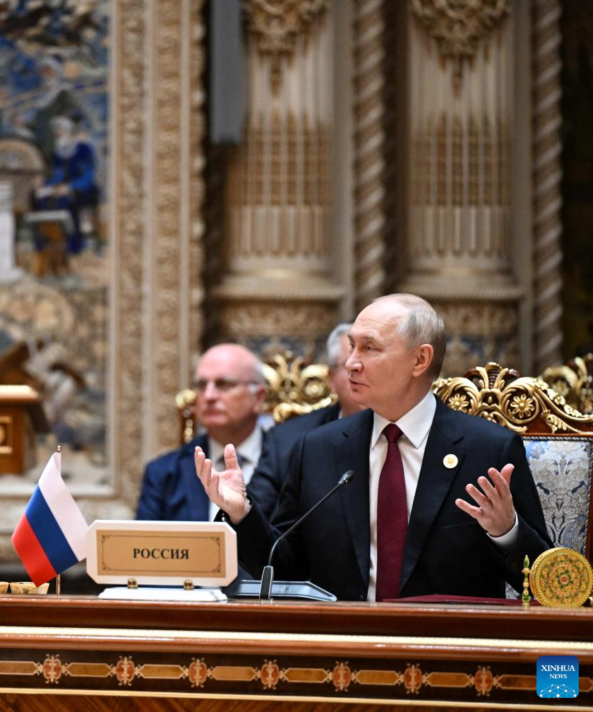 Russian President Vladimir Putin attends a meeting of the Council of Heads of State of the Commonwealth of Independent States (CIS) in Dushanbe, Tajikistan, on Oct. 10, 2025. A meeting of the Council of Heads of State of the CIS was held here Friday to review security and military cooperation, said the press service of the CIS Executive Committee. (Xinhua/Li Renzi)