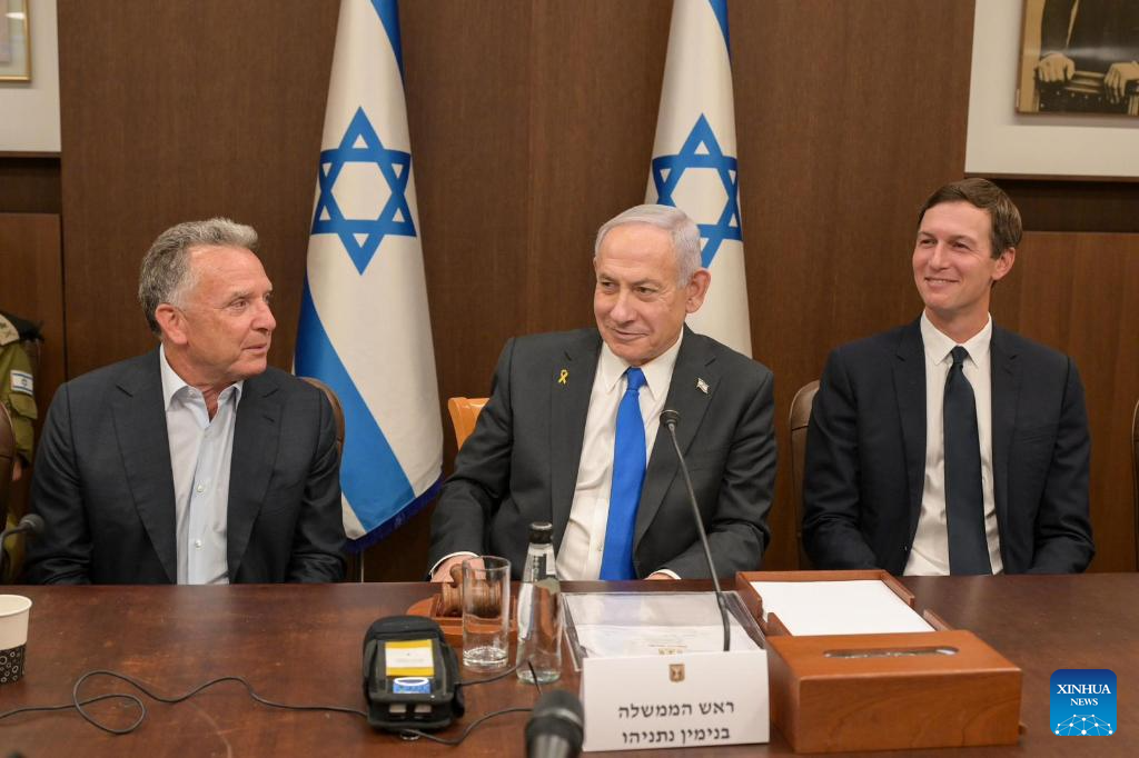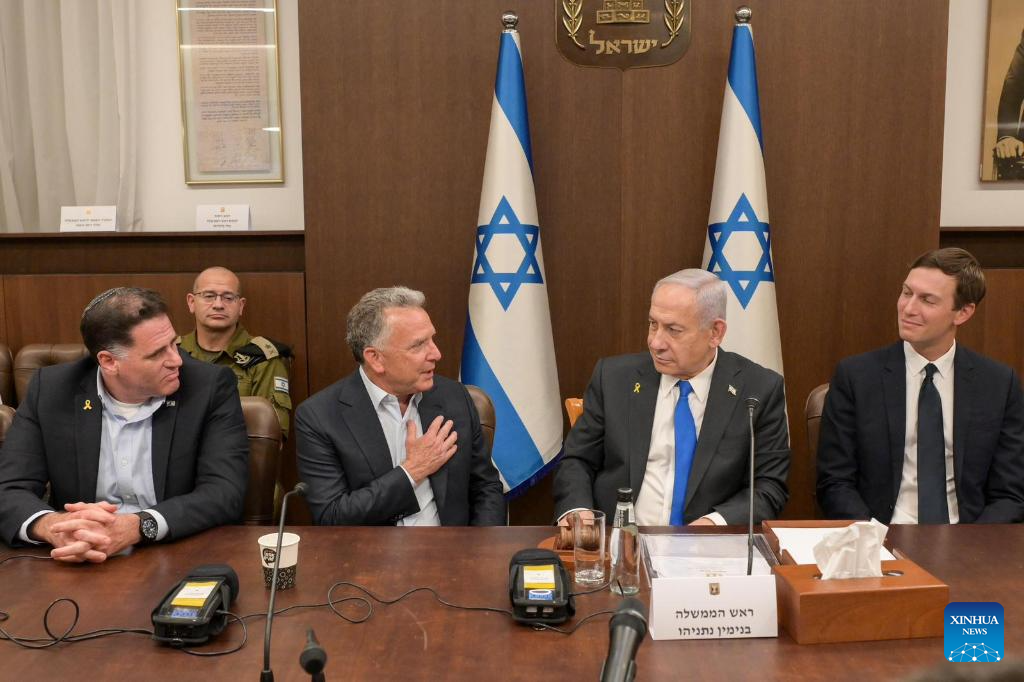Israeli Prime Minister Benjamin Netanyahu (5th L, rear), U.S. Special Envoy to the Middle East Steve Witkoff (4th L, rear) and U.S. President Donald Trump's son-in-law Jared Kushner (6th L, rear) attend a government meeting in Jerusalem on Oct. 9, 2025. The Israeli government on early Friday approved a ceasefire deal with Hamas to end the war in Gaza and secure the release of all remaining hostages. (Ma'ayan Toaf/GPO/Handout via Xinhua)