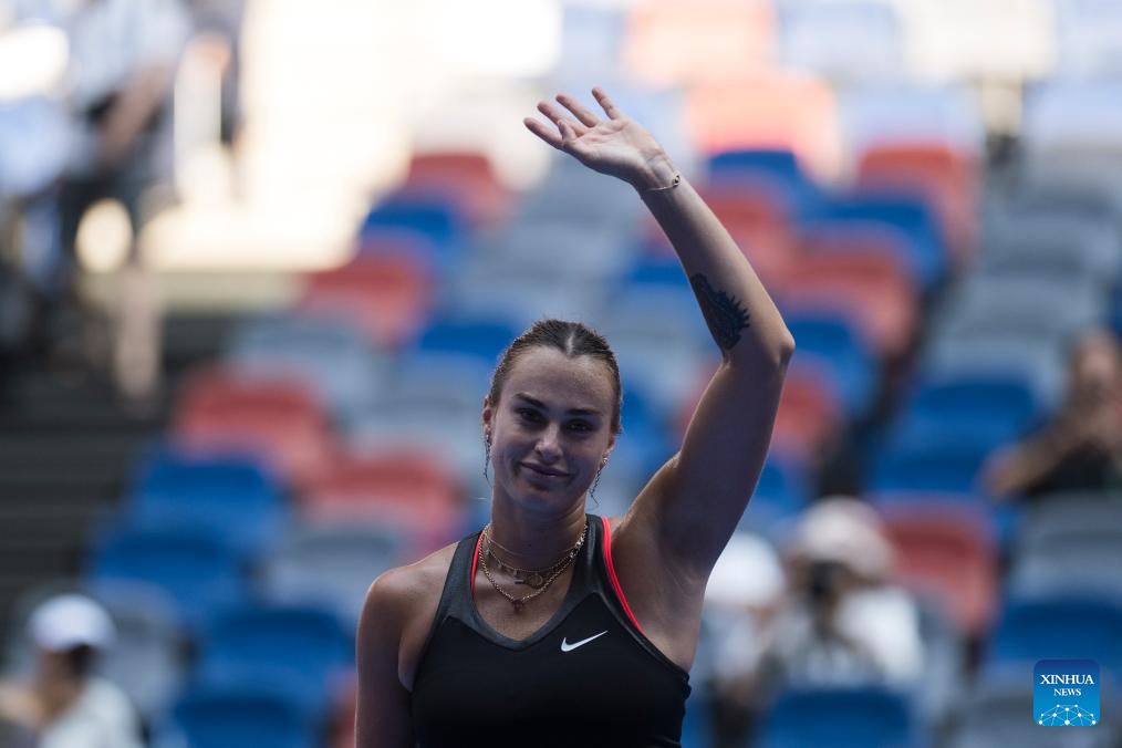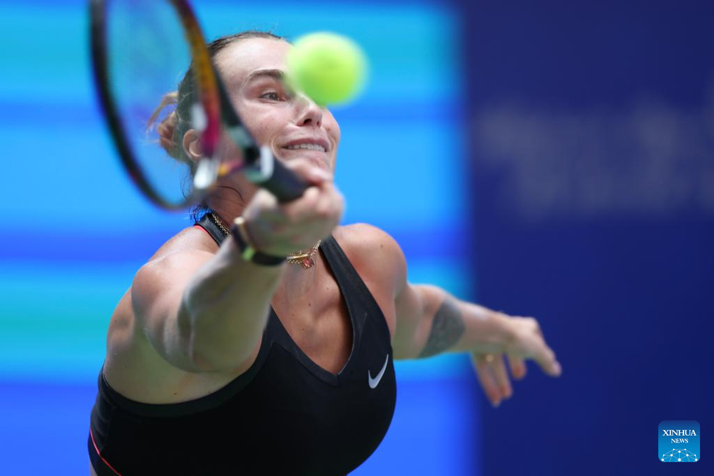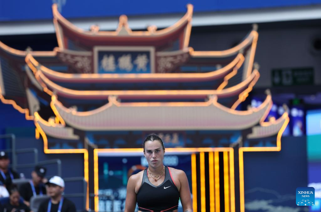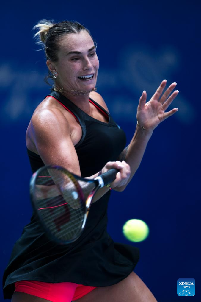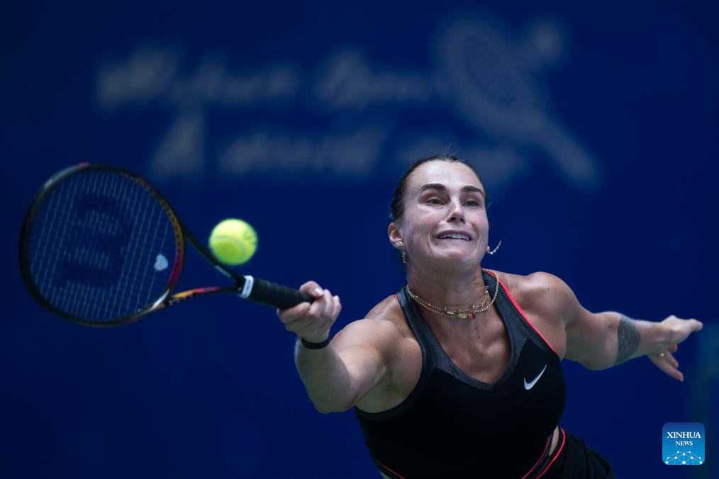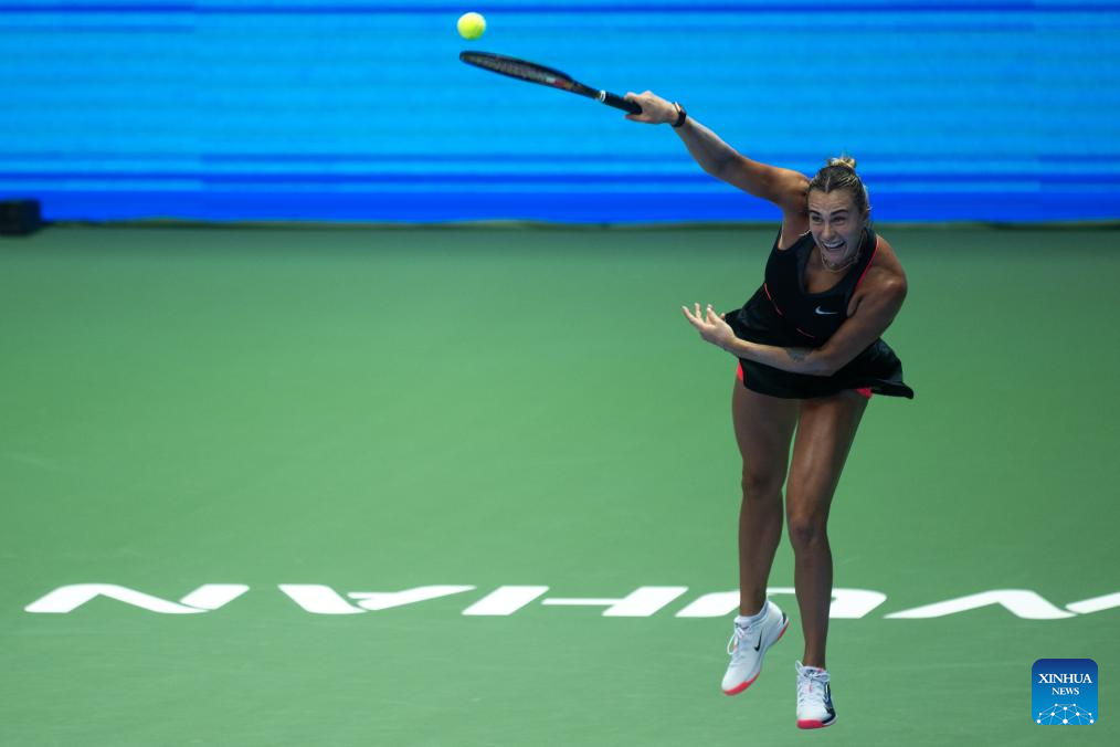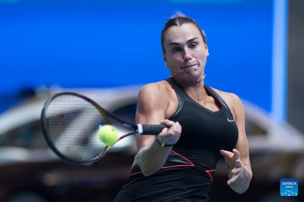 Aryna Sabalenka hits a return during the women's singles quarterfinal match between Elena Rybakina of Kazakhstan and Aryna Sabalenka of Belarus at the 2025 Wuhan Open tennis tournament in Wuhan, central China's Hubei Province, Oct. 10, 2025. (Xinhua/Bai Xuefei)