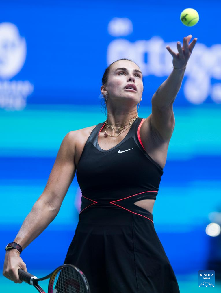 Aryna Sabalenka serves during the women's singles quarterfinal match between Elena Rybakina of Kazakhstan and Aryna Sabalenka of Belarus at the 2025 Wuhan Open tennis tournament in Wuhan, central China's Hubei Province, Oct. 10, 2025. (Xinhua/Xiao Yijiu)