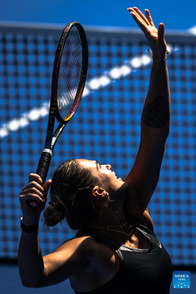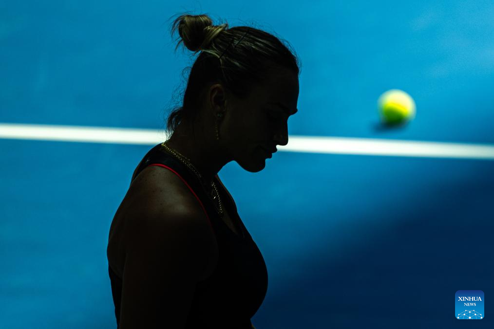 Aryna Sabalenka reacts during the women's singles quarterfinal match between Elena Rybakina of Kazakhstan and Aryna Sabalenka of Belarus at the 2025 Wuhan Open tennis tournament in Wuhan, central China's Hubei Province, Oct. 10, 2025. (Xinhua/Bai Xuefei)