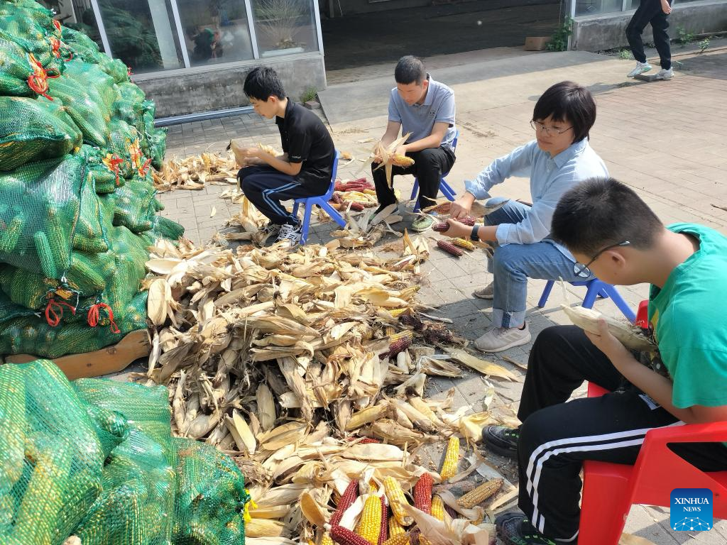 Autistic teenagers and a teacher (2nd R) peel corn at Hui'ai Farm in Xiqing District, north China's Tianjin, Sept. 30, 2025. (Xinhua)