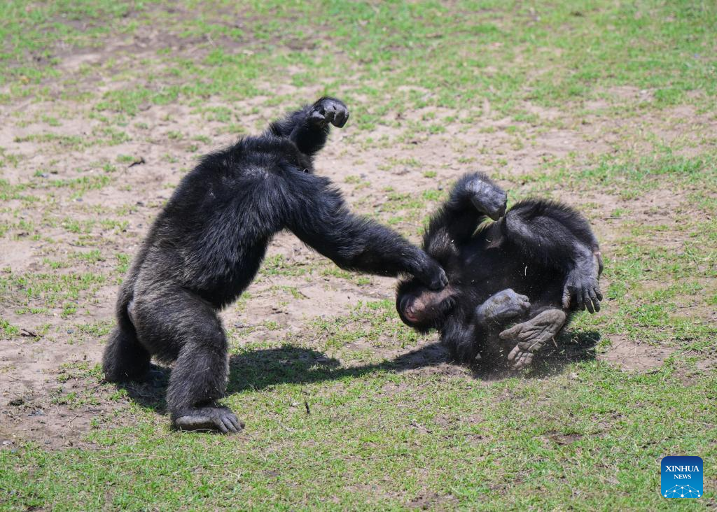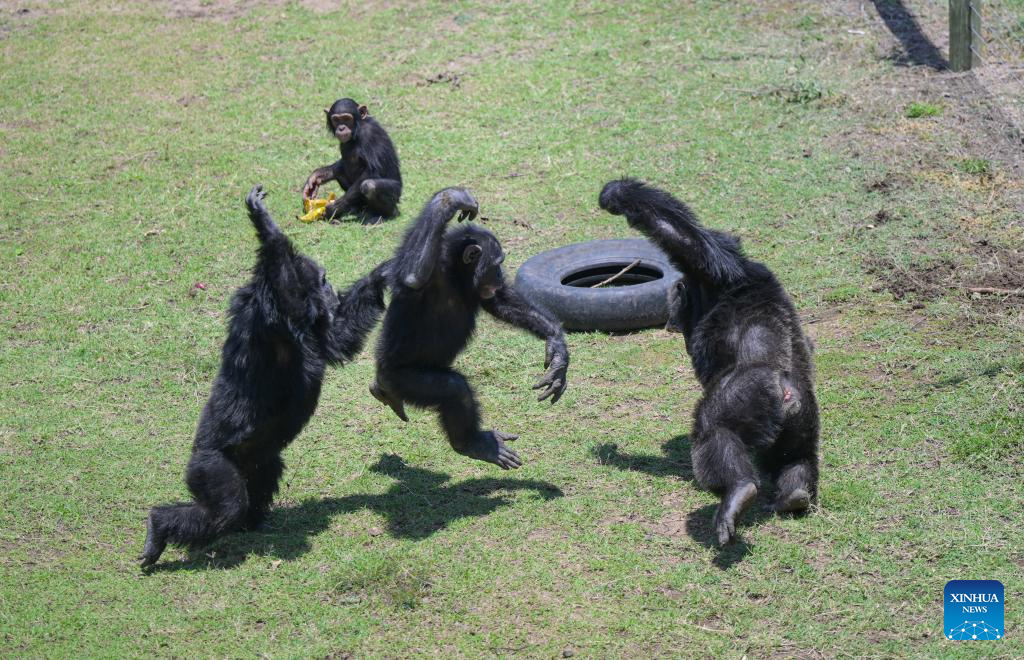 Chimpanzees are pictured in the Ol Pejeta Chimpanzee Sanctuary in Laikipia County, Kenya, Oct. 7, 2025. Established in 1993, the 250-acre Ol Pejeta Chimpanzee Sanctuary located in Laikipia County is currently home to 29 chimpanzees. (Xinhua/Yang Guang)