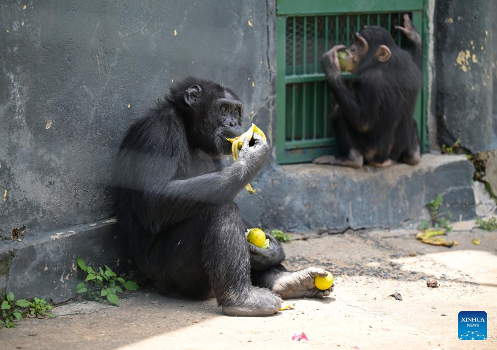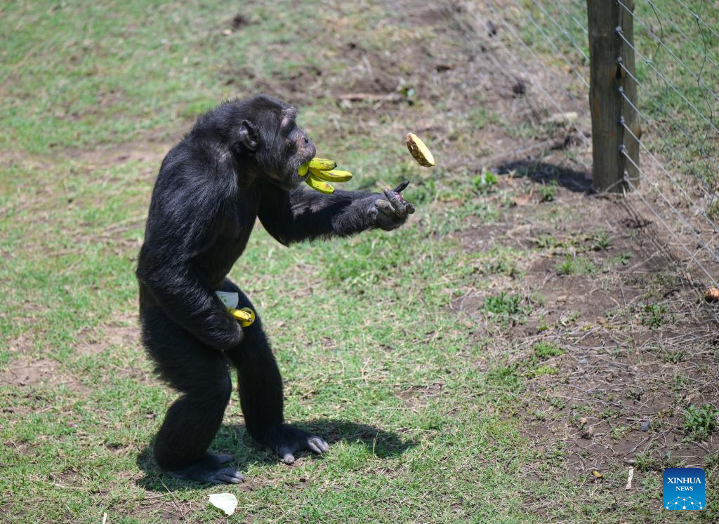 A chimpanzee eats banana in the Ol Pejeta Chimpanzee Sanctuary in Laikipia County, Kenya, Oct. 7, 2025. Established in 1993, the 250-acre Ol Pejeta Chimpanzee Sanctuary located in Laikipia County is currently home to 29 chimpanzees. (Xinhua/Yang Guang)