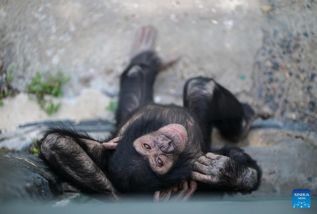 A chimpanzee rests in the Ol Pejeta Chimpanzee Sanctuary in Laikipia County, Kenya, Oct. 7, 2025. Established in 1993, the 250-acre Ol Pejeta Chimpanzee Sanctuary located in Laikipia County is currently home to 29 chimpanzees. (Xinhua/Yang Guang)