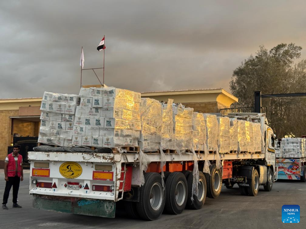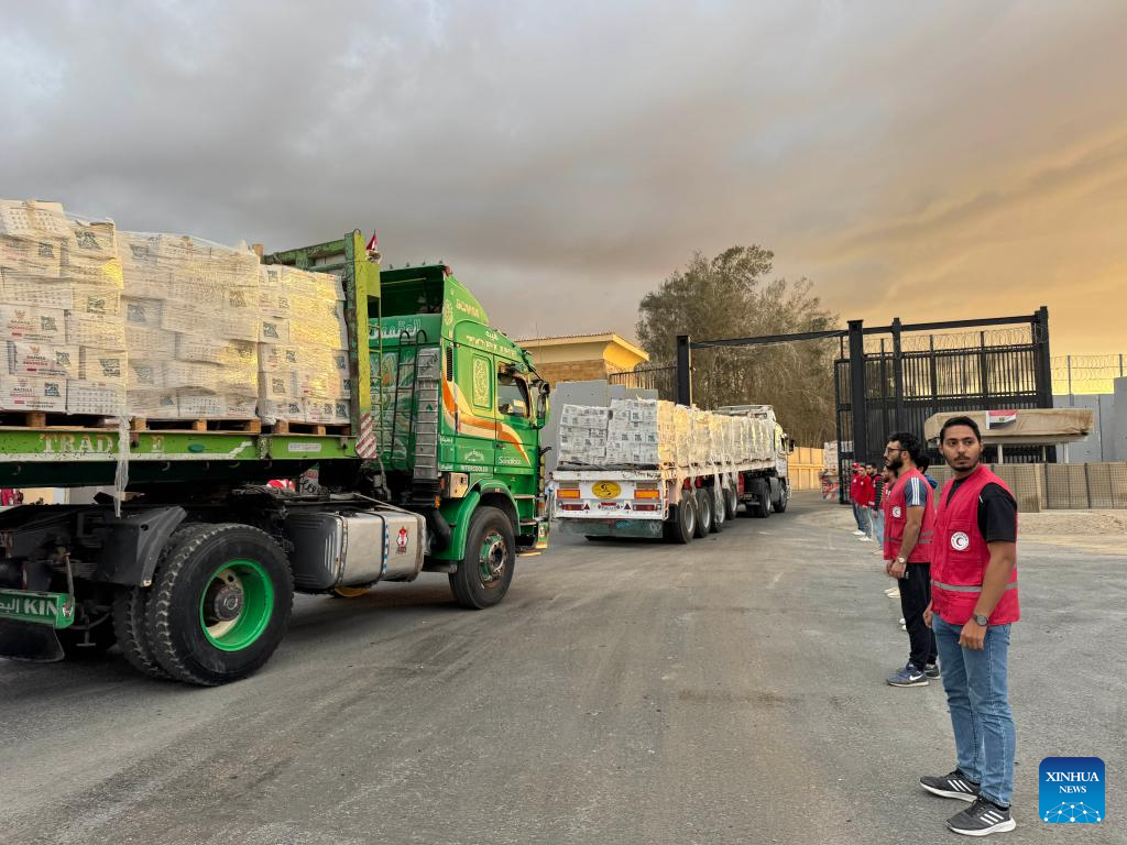 Trucks carrying humanitarian aids enter Gaza from the Egyptian side of the Rafah border crossing on Oct. 12, 2025. Egyptian President Abdel Fattah al-Sisi said on Friday that Egypt has begun sending urgent food and medical aid to the Gaza Strip following a ceasefire agreement between Israel and Hamas. (Photo by Ali Mostafa/Xinhua)