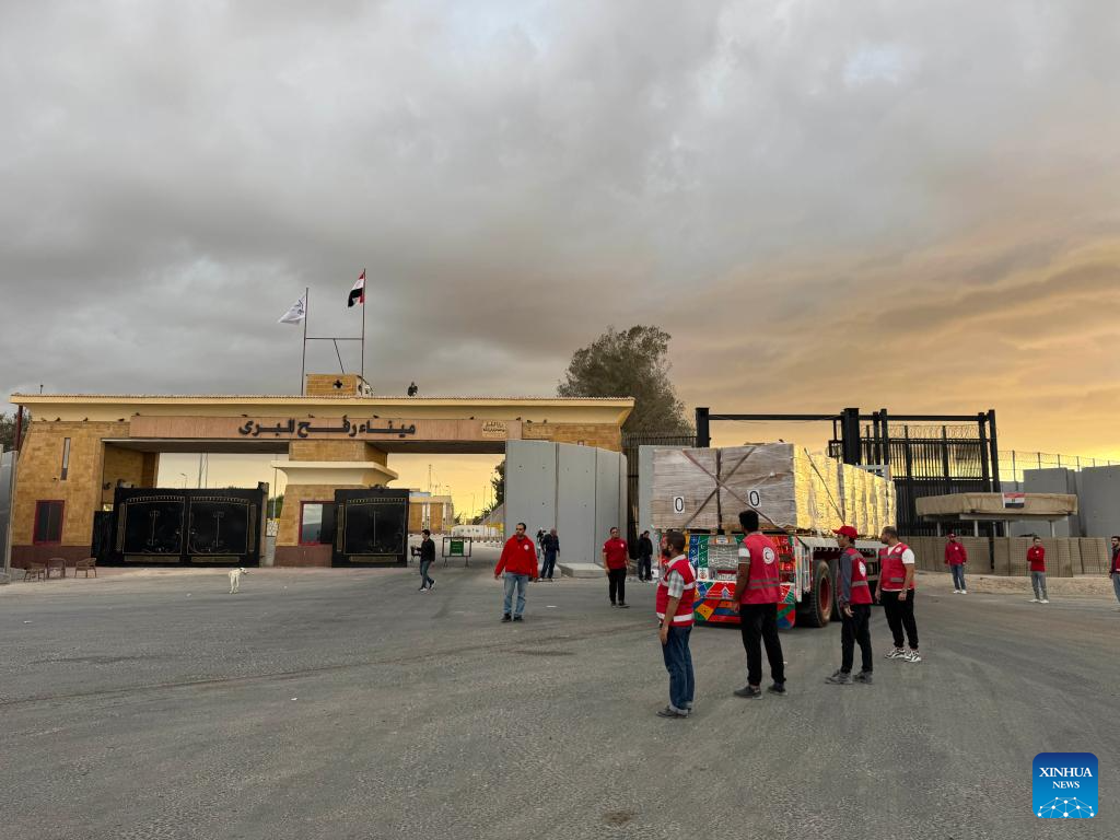 Staff members from Egyptian Red Crescent stand near the trucks carrying humanitarian aids as they enter Gaza from the Egyptian side of the Rafah border crossing on Oct. 12, 2025. Egyptian President Abdel Fattah al-Sisi said on Friday that Egypt has begun sending urgent food and medical aid to the Gaza Strip following a ceasefire agreement between Israel and Hamas. (Photo by Ali Mostafa/Xinhua)