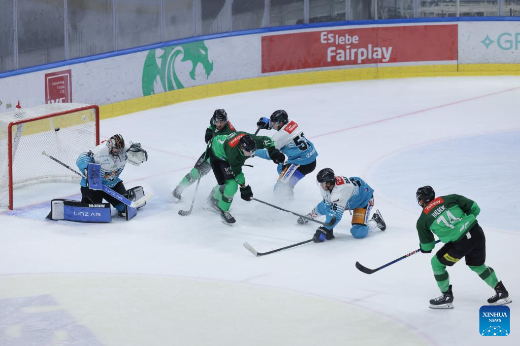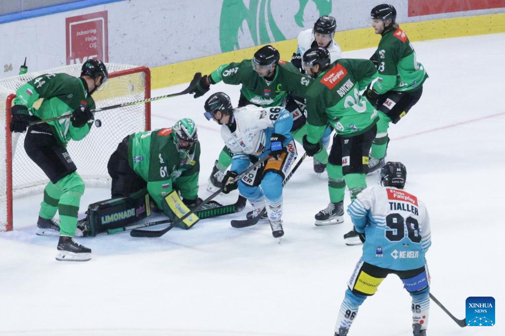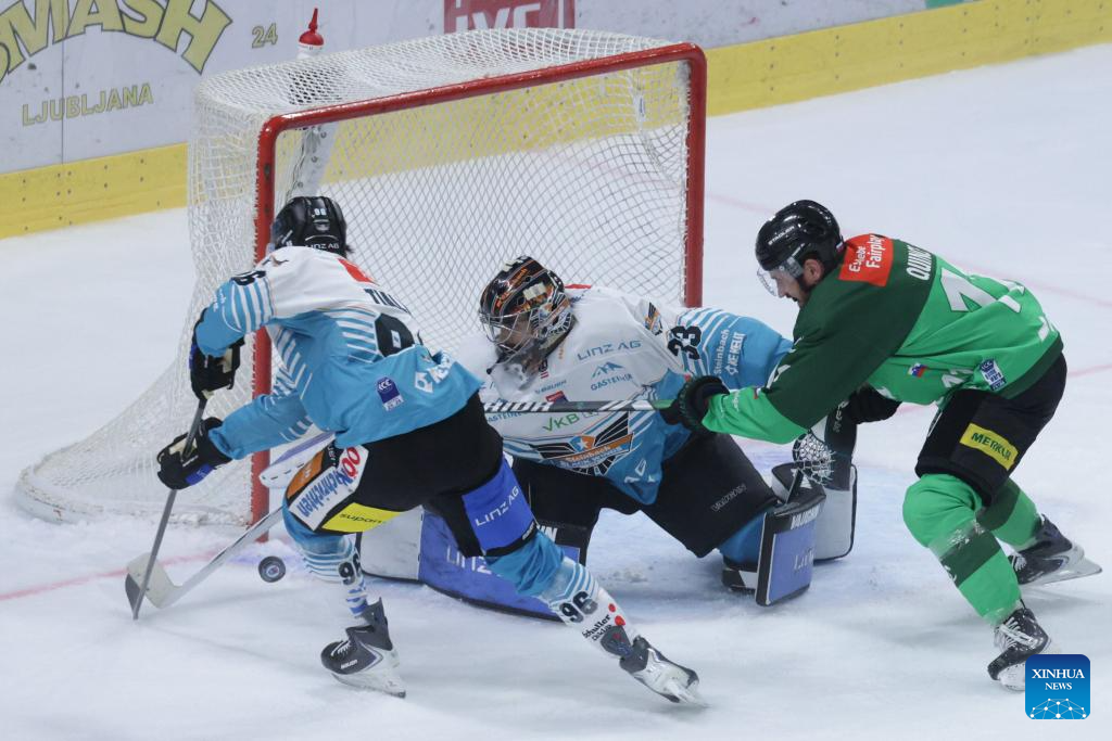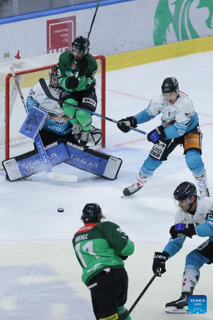 Ziga Mehle (Bottom L) of HK Olimpija shoots to score during the 2025/26 Win2day Ice Hockey League match between HK Olimpija and Steinbach Black Wings Linz in Ljubljana, Slovenia, Oct.10, 2025. (Photo by Zeljko Stevanic/Xinhua)