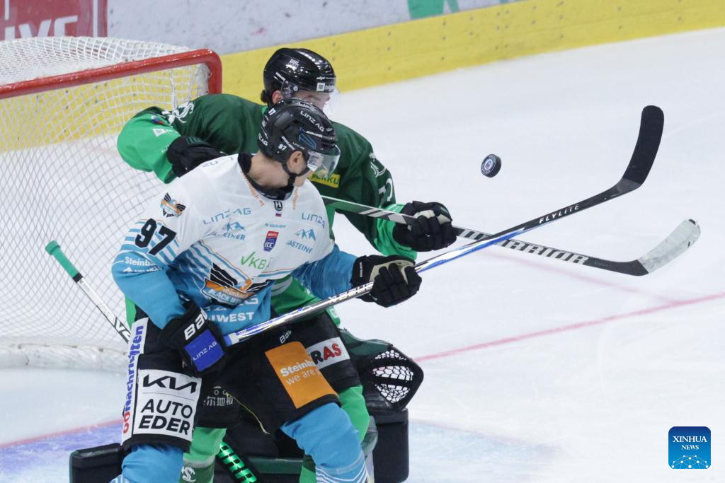 Marly Quince (R) of HK Olimpija vies with Christoph Tialler of Steinbach Black Wings Linz during the 2025/26 Win2day Ice Hockey League match between HK Olimpija and Steinbach Black Wings Linz in Ljubljana, Slovenia, Oct.10, 2025. (Photo by Zeljko Stevanic/Xinhua)