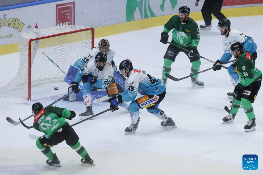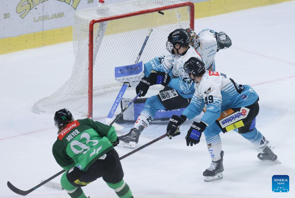 Stefan Gaffal (3rd L) of Steinbach Black Wings Linz shoots to score during the 2025/26 Win2day Ice Hockey League match between HK Olimpija and Steinbach Black Wings Linz in Ljubljana, Slovenia, Oct.10, 2025. (Photo by Zeljko Stevanic/Xinhua)