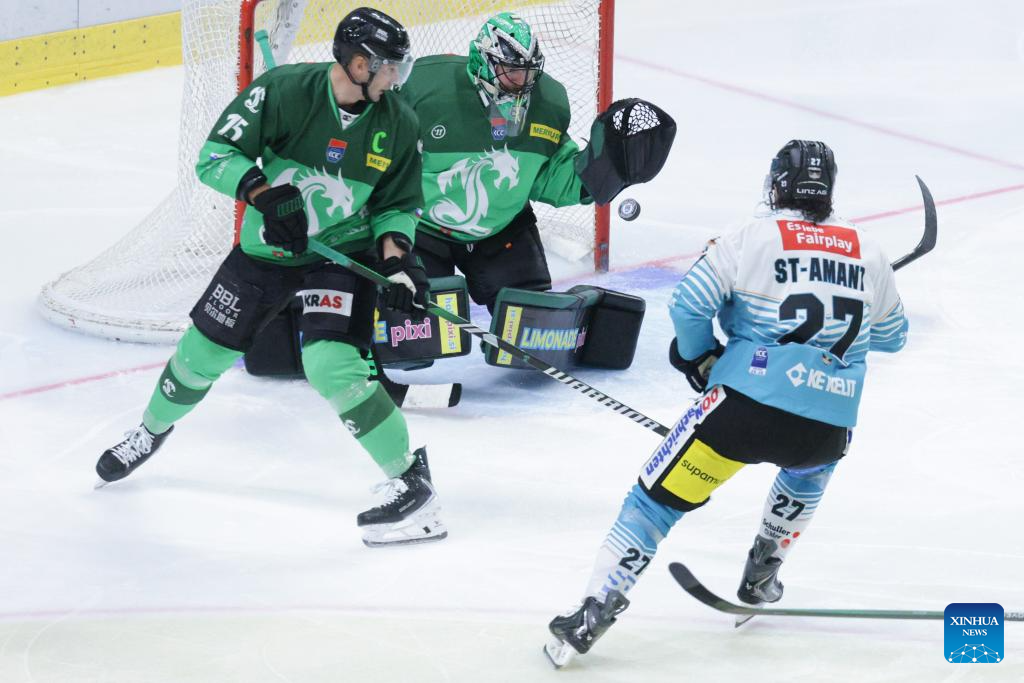 Shawn St-Amant (R) of Steinbach Black Wings Linz shoots to score during the 2025/26 Win2day Ice Hockey League match between HK Olimpija and Steinbach Black Wings Linz in Ljubljana, Slovenia, Oct.10, 2025. (Photo by Zeljko Stevanic/Xinhua)