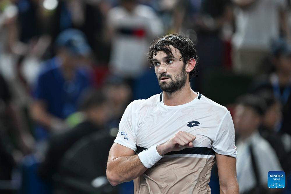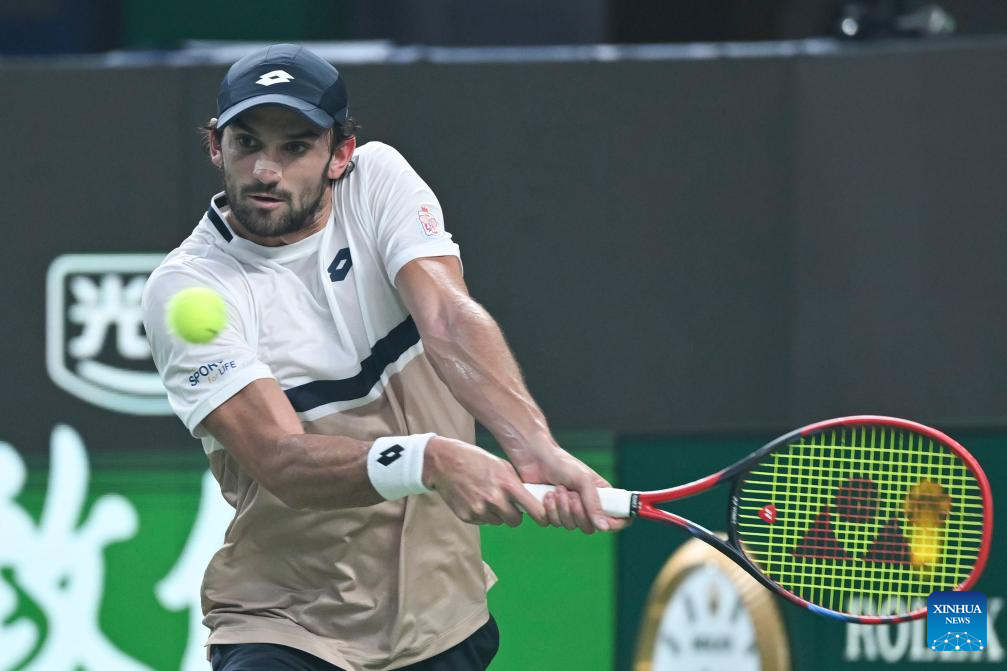 Valentin Vacherot hits a return during the men's singles semifinal between Novak Djokovic of Serbia and Valentin Vacherot of Monaco at the ATP World Tour Shanghai Masters tennis tournament in Shanghai, east China, Oct. 11, 2025. (Xinhua/Chen Haoming)