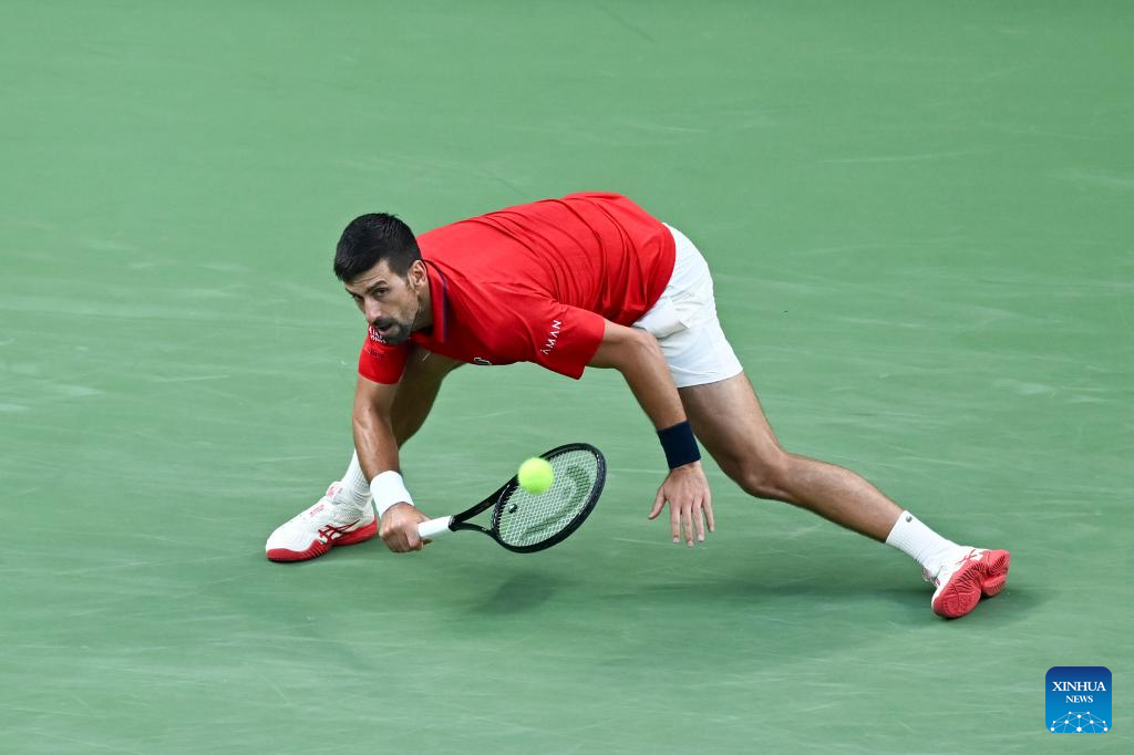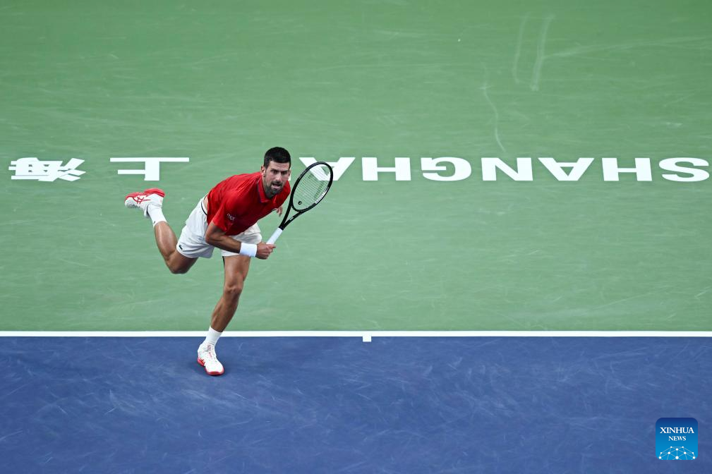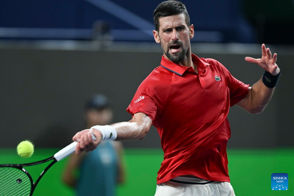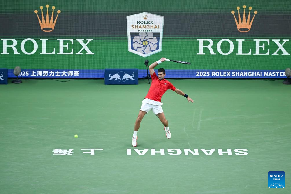 Novak Djokovic hits a return during the men's singles semifinal between Novak Djokovic of Serbia and Valentin Vacherot of Monaco at the ATP World Tour Shanghai Masters tennis tournament in Shanghai, east China, Oct. 11, 2025. (Xinhua/Chen Haoming)