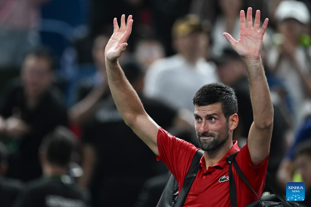 Novak Djokovic waves to spectators while leaving the court after the men's singles semifinal between Novak Djokovic of Serbia and Valentin Vacherot of Monaco at the ATP World Tour Shanghai Masters tennis tournament in Shanghai, east China, Oct. 11, 2025. (Xinhua/Chen Haoming)