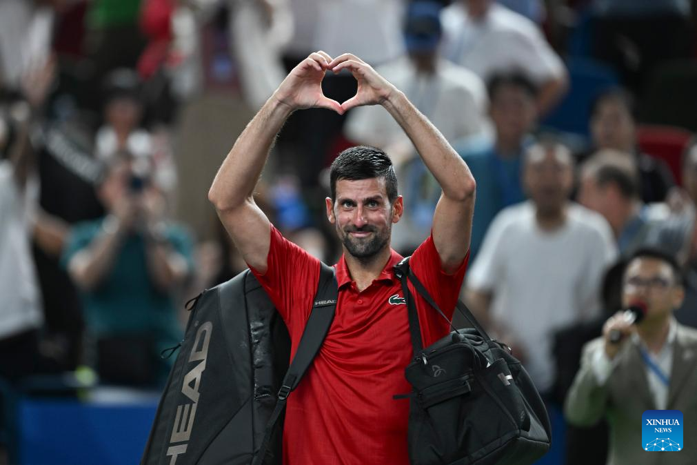 Novak Djokovic gestures to spectators after the men's singles semifinal between Novak Djokovic of Serbia and Valentin Vacherot of Monaco at the ATP World Tour Shanghai Masters tennis tournament in Shanghai, east China, Oct. 11, 2025. (Xinhua/Chen Haoming)