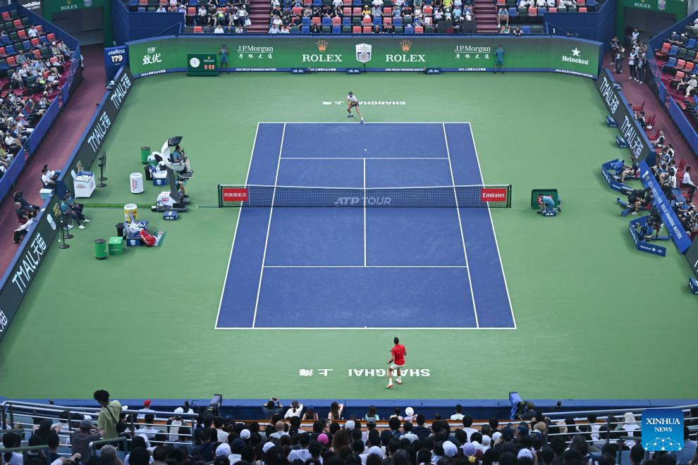 Novak Djokovic (bottom) of Serbia and Valentin Vacherot of Monaco compete during the men's singles semifinal at the ATP World Tour Shanghai Masters tennis tournament in Shanghai, east China, Oct. 11, 2025. (Xinhua/Chen Haoming)