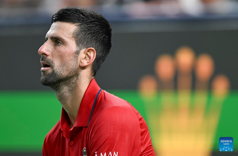 Novak Djokovic reacts during the men's singles semifinal between Novak Djokovic of Serbia and Valentin Vacherot of Monaco at the ATP World Tour Shanghai Masters tennis tournament in Shanghai, east China, Oct. 11, 2025. (Xinhua/Chen Haoming)