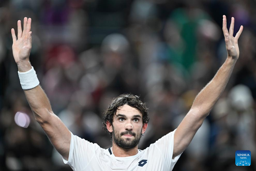 Valentin Vacherot celebrates after the men's singles semifinal between Novak Djokovic of Serbia and Valentin Vacherot of Monaco at the ATP World Tour Shanghai Masters tennis tournament in Shanghai, east China, Oct. 11, 2025. (Xinhua/Chen Haoming)
