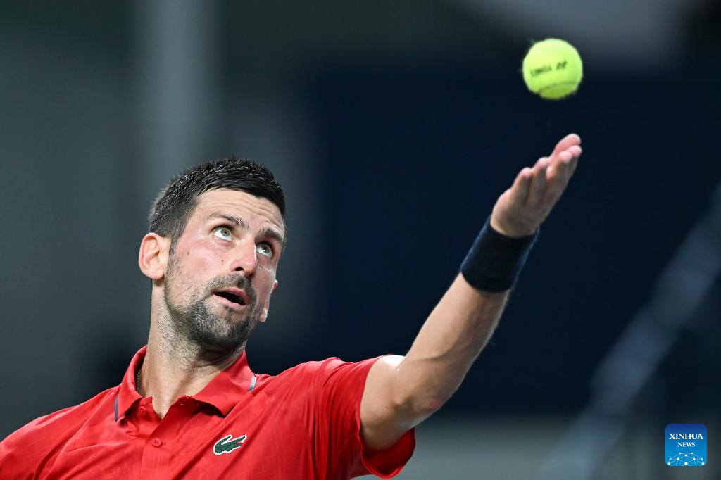 Novak Djokovic serves during the men's singles semifinal between Novak Djokovic of Serbia and Valentin Vacherot of Monaco at the ATP World Tour Shanghai Masters tennis tournament in Shanghai, east China, Oct. 11, 2025. (Xinhua/Chen Haoming)