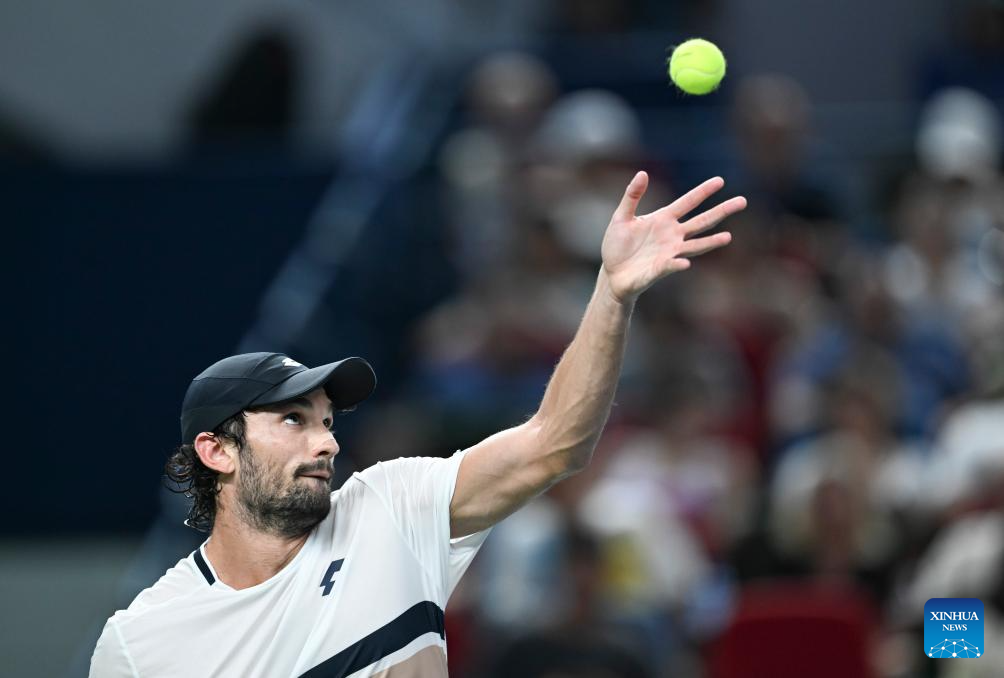 Valentin Vacherot serves during the men's singles semifinal between Novak Djokovic of Serbia and Valentin Vacherot of Monaco at the ATP World Tour Shanghai Masters tennis tournament in Shanghai, east China, Oct. 11, 2025. (Xinhua/Chen Haoming)