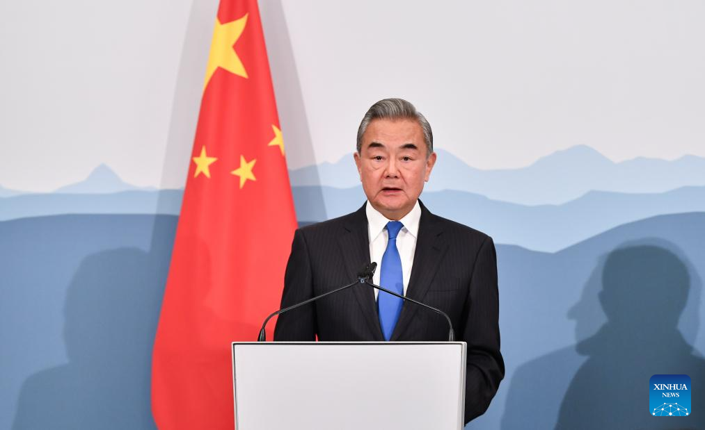 Chinese Foreign Minister Wang Yi, also a member of the Political Bureau of the Communist Party of China (CPC) Central Committee, and Swiss Federal Councillor and Foreign Minister Ignazio Cassis (not in the picture) meet the press in Bellinzona, Switzerland, Oct. 10, 2025. (Xinhua/Lian Yi)