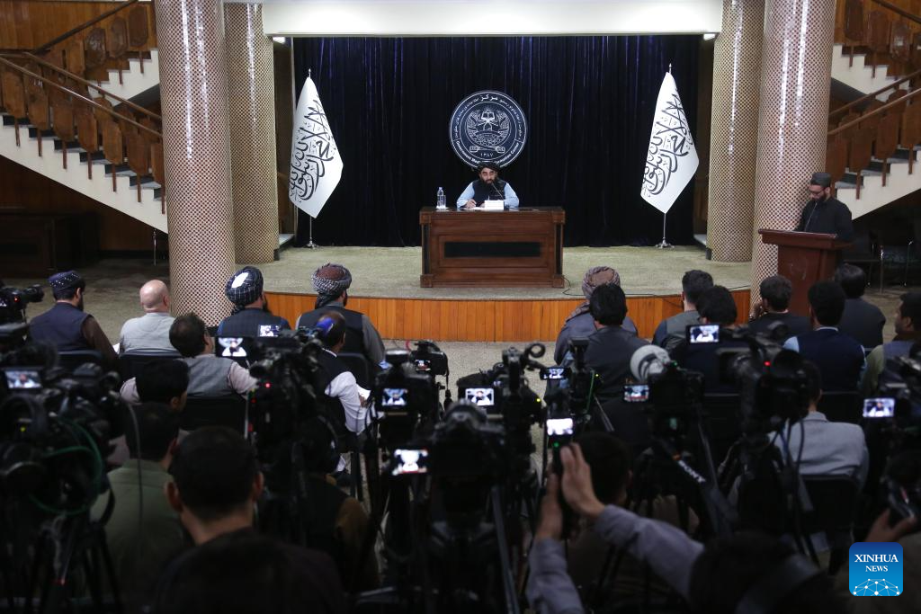Afghan government's chief spokesman Zabihullah Mujahid speaks during a press conference in Kabul, Afghanistan, on Oct. 12, 2025. Zabihullah Mujahid has utterly rejected any reports on a deal with the United States over Bagram airbase, saying that Afghans won't give any part of their soil to any country. (Photo by Saifurahman Safi/Xinhua)