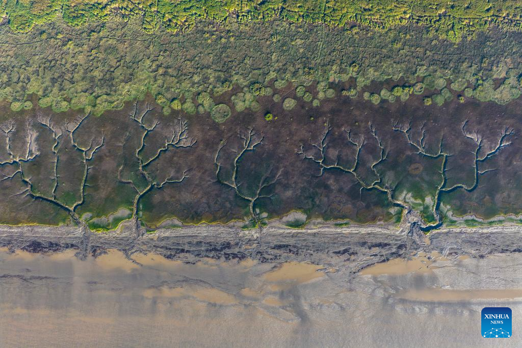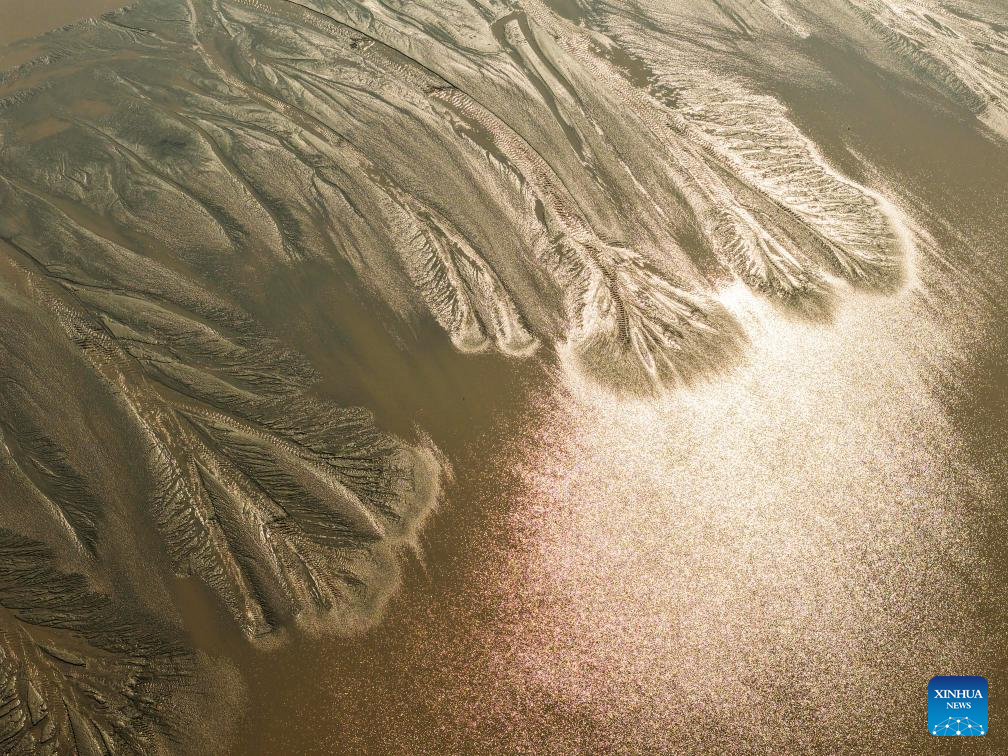 An aerial drone photo taken on Oct. 11, 2025 shows a view of the tidal flat after the tidal bore of Qiantang River receded, in Haining City, east China's Zhejiang Province. The Qiantang River tidal bore, famous for its height and speed, is a traditional tourist attraction in Zhejiang Province. Every year, soaring waves crash along the banks of the river, near the city of Haining. After the ebb of the tide, different tree-shaped patterns appear on the tidal flat. (Xinhua/Xu Yu)