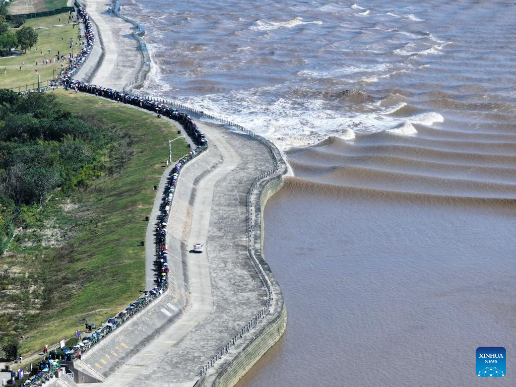 An aerial drone photo taken on Oct. 10, 2025 shows tourists watching the tidal bore of the Qiantang River in Haining City, east China's Zhejiang Province. The Qiantang River tidal bore, famous for its height and speed, is a traditional tourist attraction in Zhejiang Province. Every year, soaring waves crash along the banks of the river, near the city of Haining. After the ebb of the tide, different tree-shaped patterns appear on the tidal flat. (Xinhua/Xu Yu)